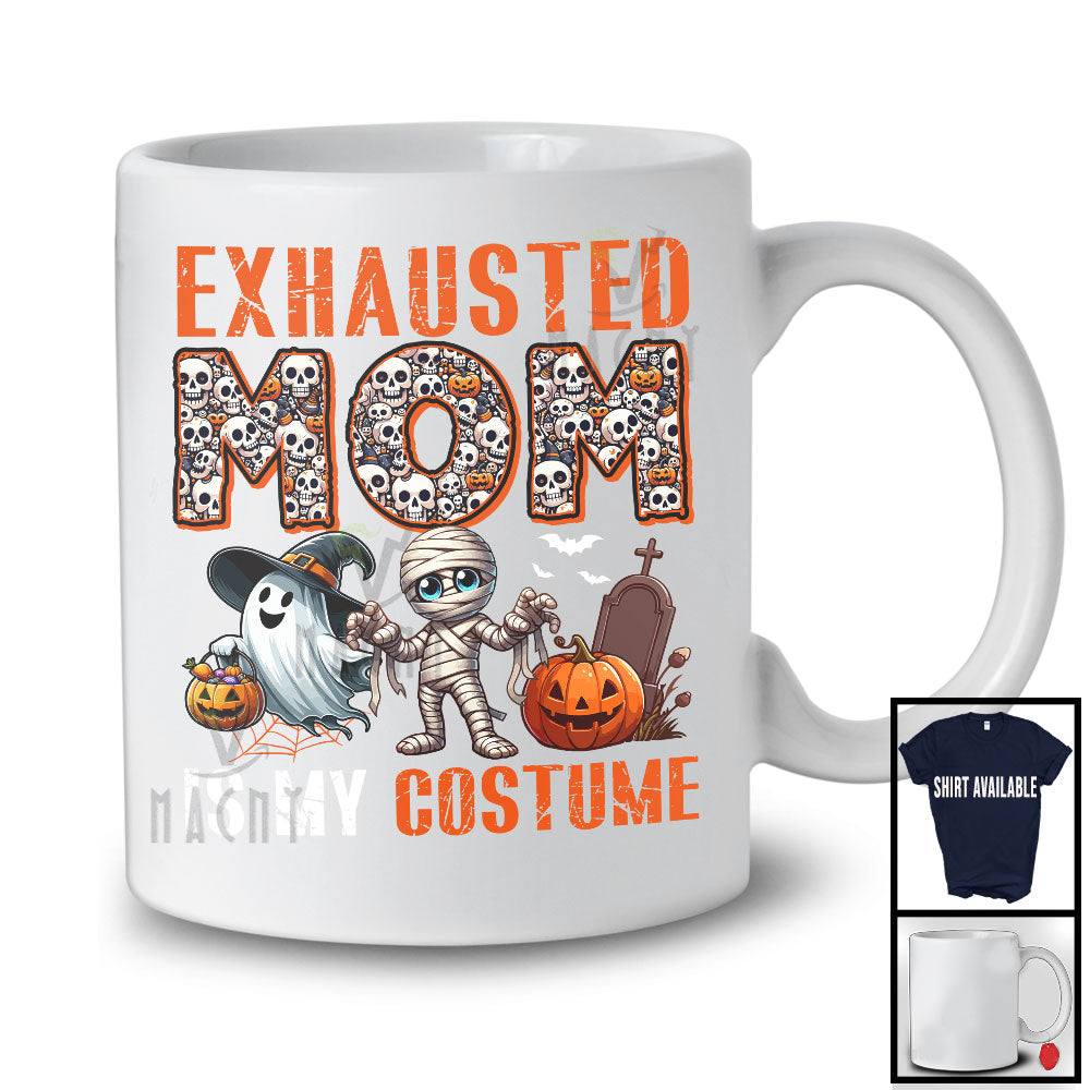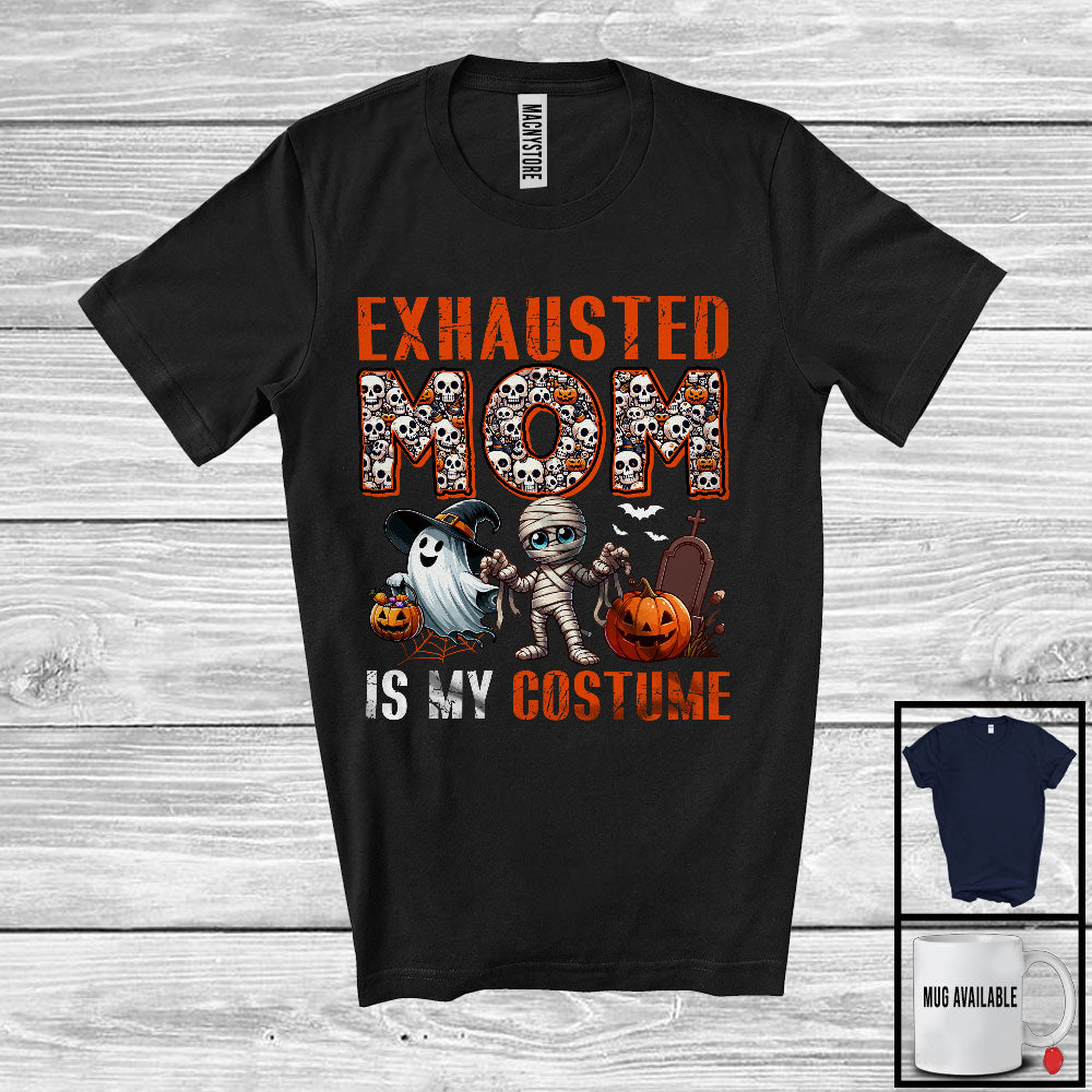 Exhausted Mom Is My Costume; Spooky Halloween Costume Skull Mummy; Women Family Group T-Shirt. This cotton t-shirt is a durable staple product with a classic fit. One of the most popular items, it has a relaxed style made for everyday and casual wear.