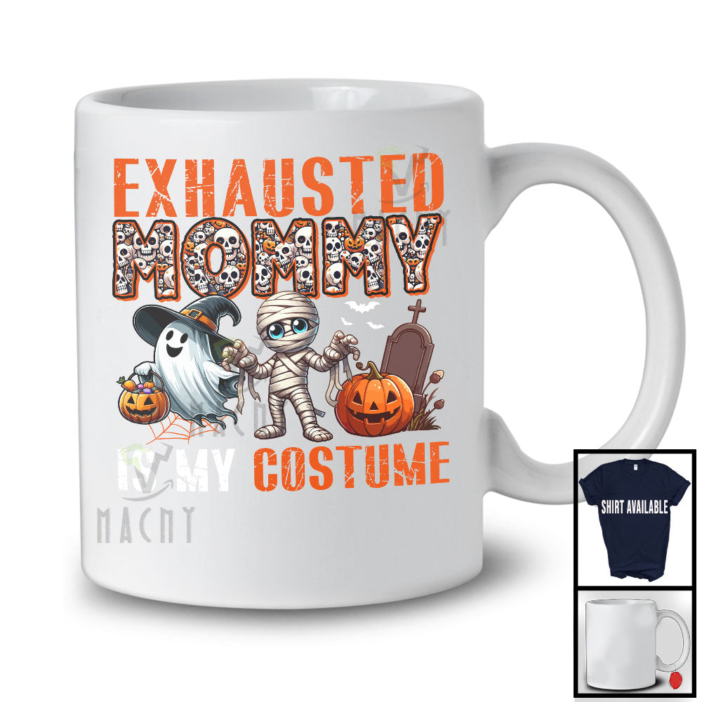Exhausted Mommy Is My Costume; Spooky Halloween Costume Skull Mummy; Women Family Group T-Shirt. This cotton t-shirt is a durable staple product with a classic fit. One of the most popular items, it has a relaxed style made for everyday and casual wear.