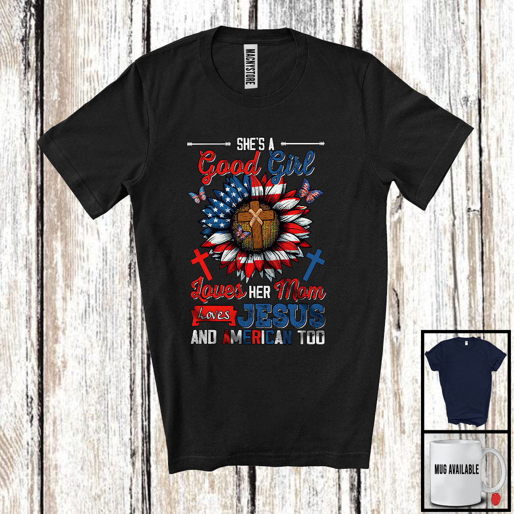 Good Girl Loves Her Mom Jesus And American Too, Awesome 4th Of July Sunflower, Patriotic T-Shirt