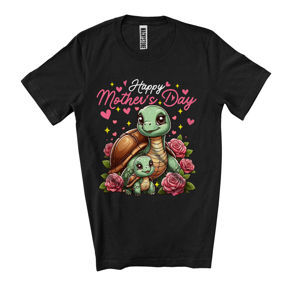 Happy Mother's Day, Adorable Turtle Mom And Baby Flowers, Wild Animal Matching Family T-Shirt