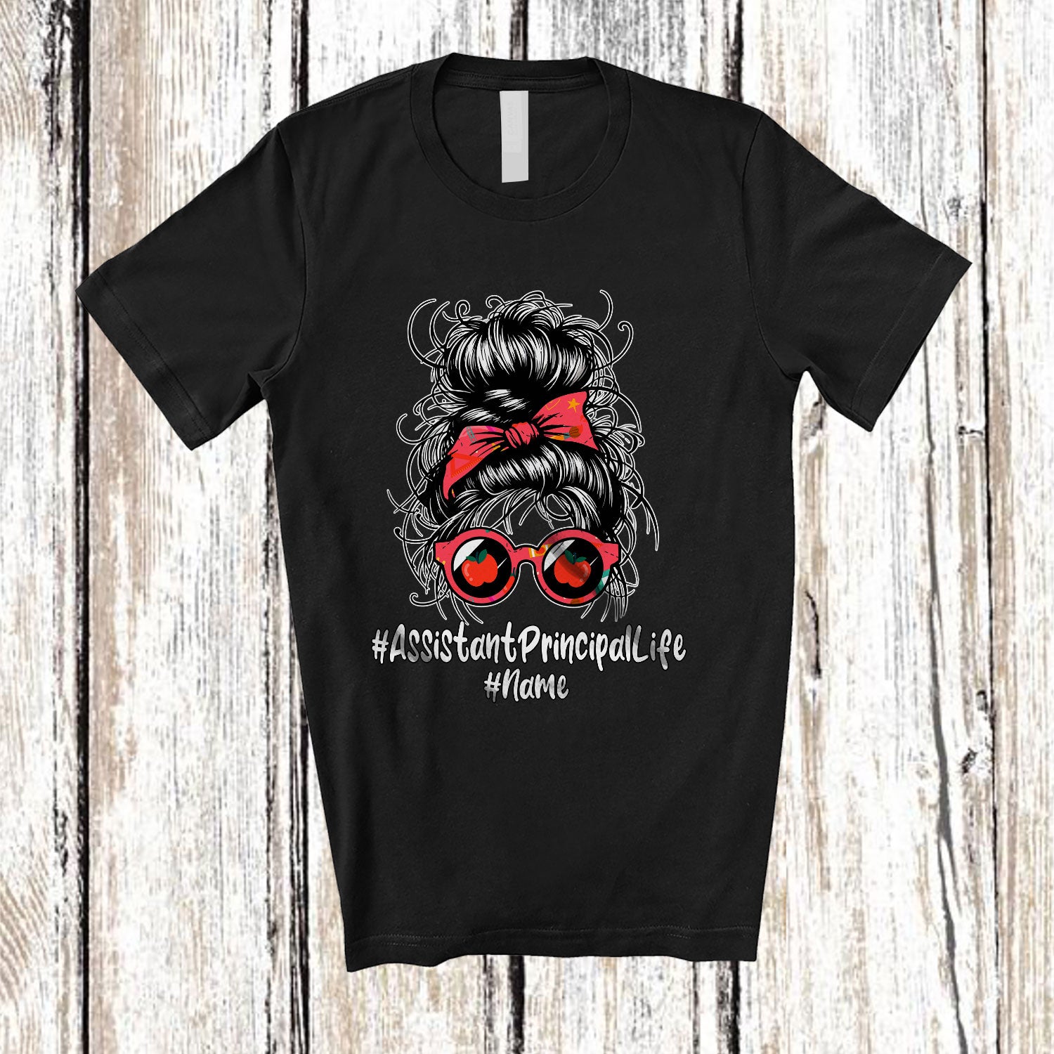 • Personalized AssistantPrincipallife; Proud Mother's Day Custom Name Assistant Principal Messy Bun Hair T-Shirt. This cotton t-shirt is a durable staple product with a classic fit. One of the most popular items, it has a relaxed style made for everyday and casual wear.
