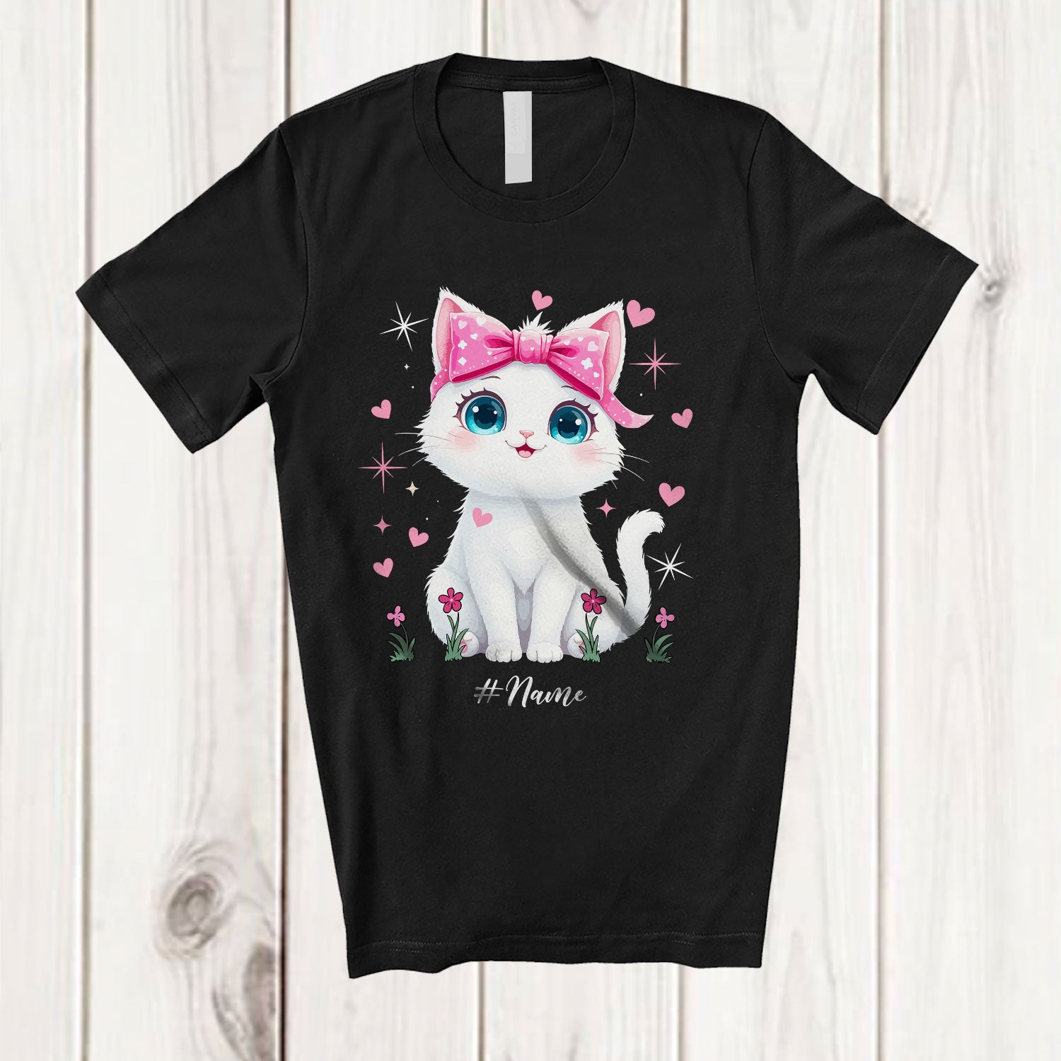 Personalized Custom Name Coquette Bow Cat; Lovely Mother's Day Pinks Hearts T-Shirt