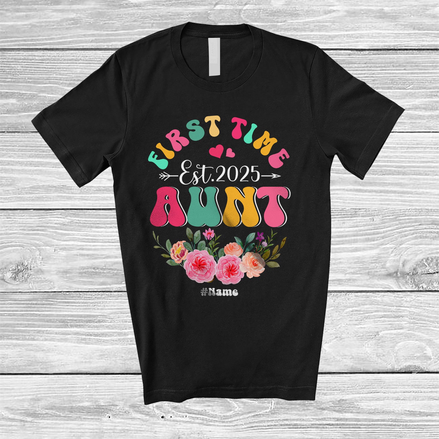 Personalized Custom Name First Time Aunt Est. 2025; Lovely Mother's Day Pregnancy Flowers T-Shirt. This cotton t-shirt is a durable staple product with a classic fit. One of the most popular items, it has a relaxed style made for everyday and casual wear.