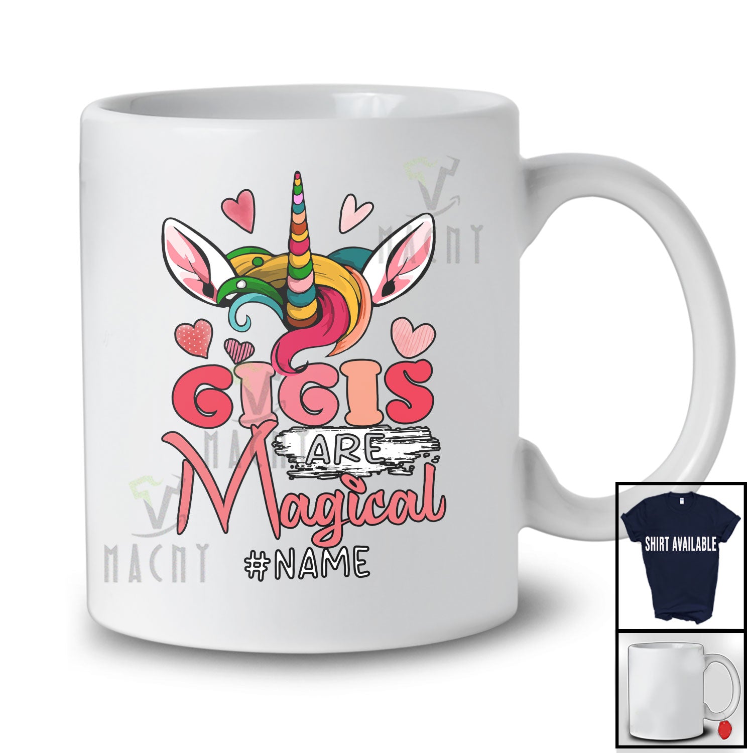 • Personalized Custom Name Gigis are Magical; Fantastic Mother's Day Unicorn Face; Family T-Shirt. This cotton t-shirt is a durable staple product with a classic fit. One of the most popular items, it has a relaxed style made for everyday and casual wear.