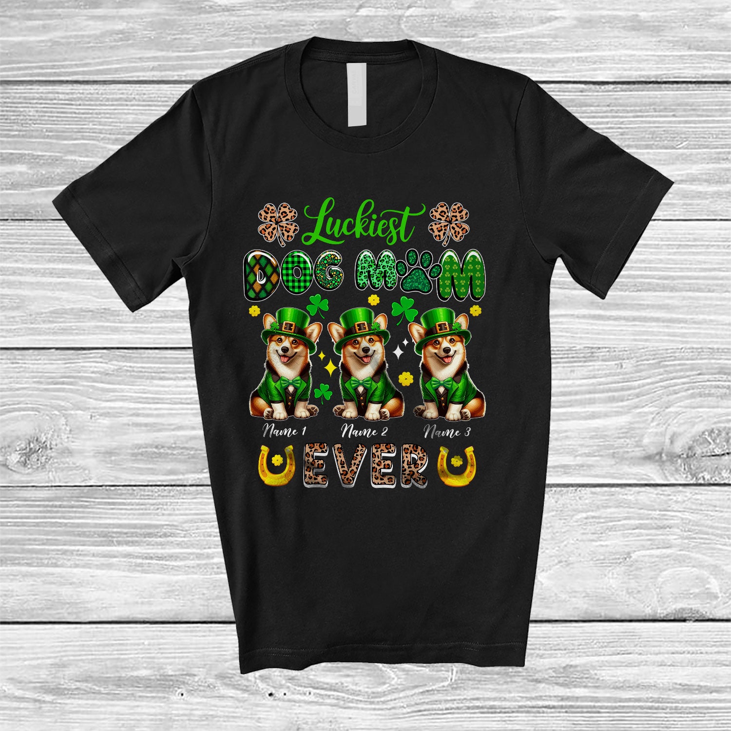 Personalized Custom Name Luckiest Dog Mom Ever; Lovely St. Patrick's Day Three Corgi Owner T-Shirt
