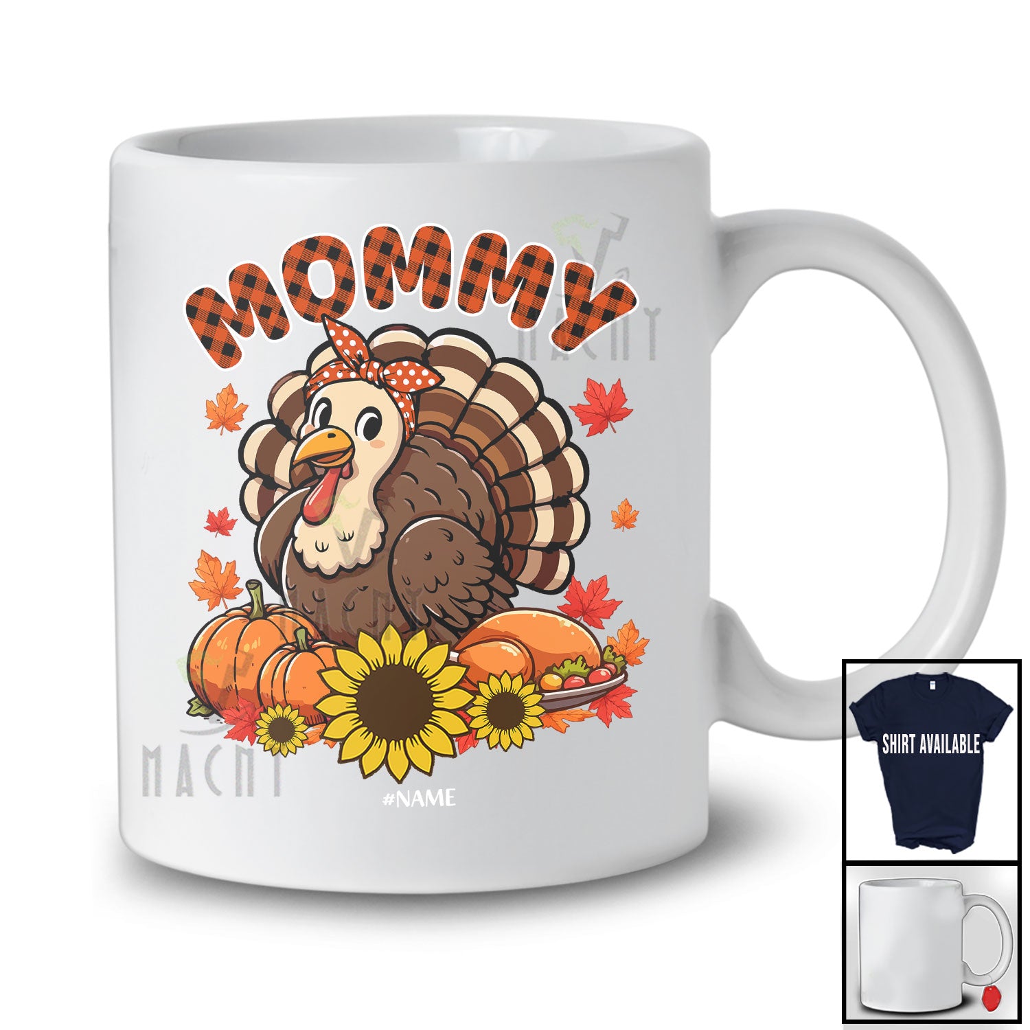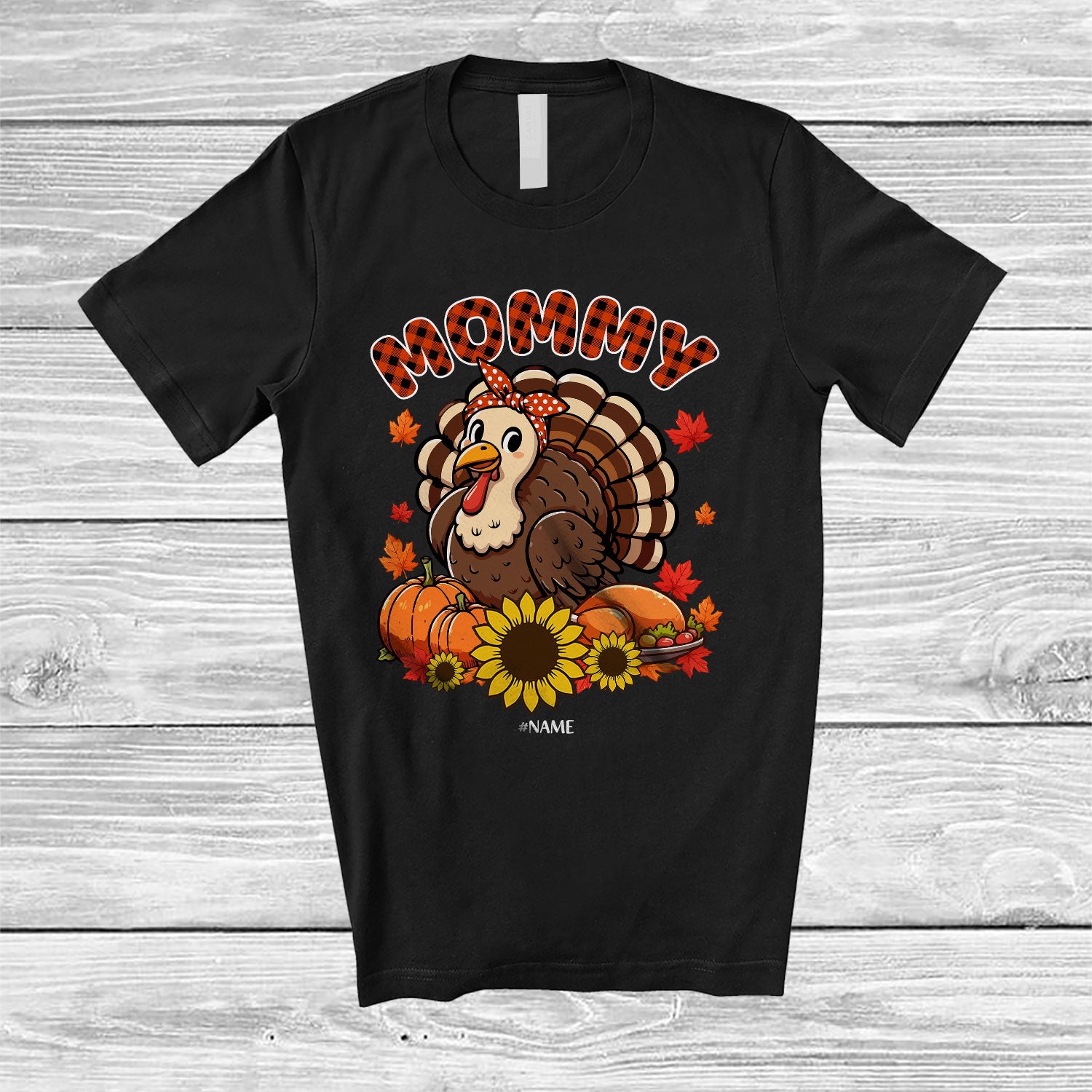 Personalized Custom Name Mommy; Lovely Thanksgiving Plaid Turkey Pumpkin Sunflower; Family T-Shirt. This cotton t-shirt is a durable staple product with a classic fit. One of the most popular items, it has a relaxed style made for everyday and casual wear.