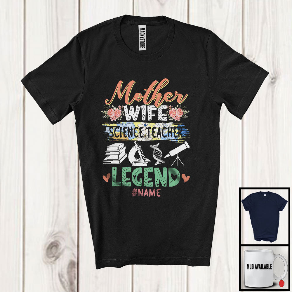 This Personalized Custom Name Mother Wife Science Teacher Legend, Adorable Mother's Day Flowers T-Shirt is great idea gift for your family, friends in this birthday, christmas, mother's day, father's day, patrick's day or any holiday.