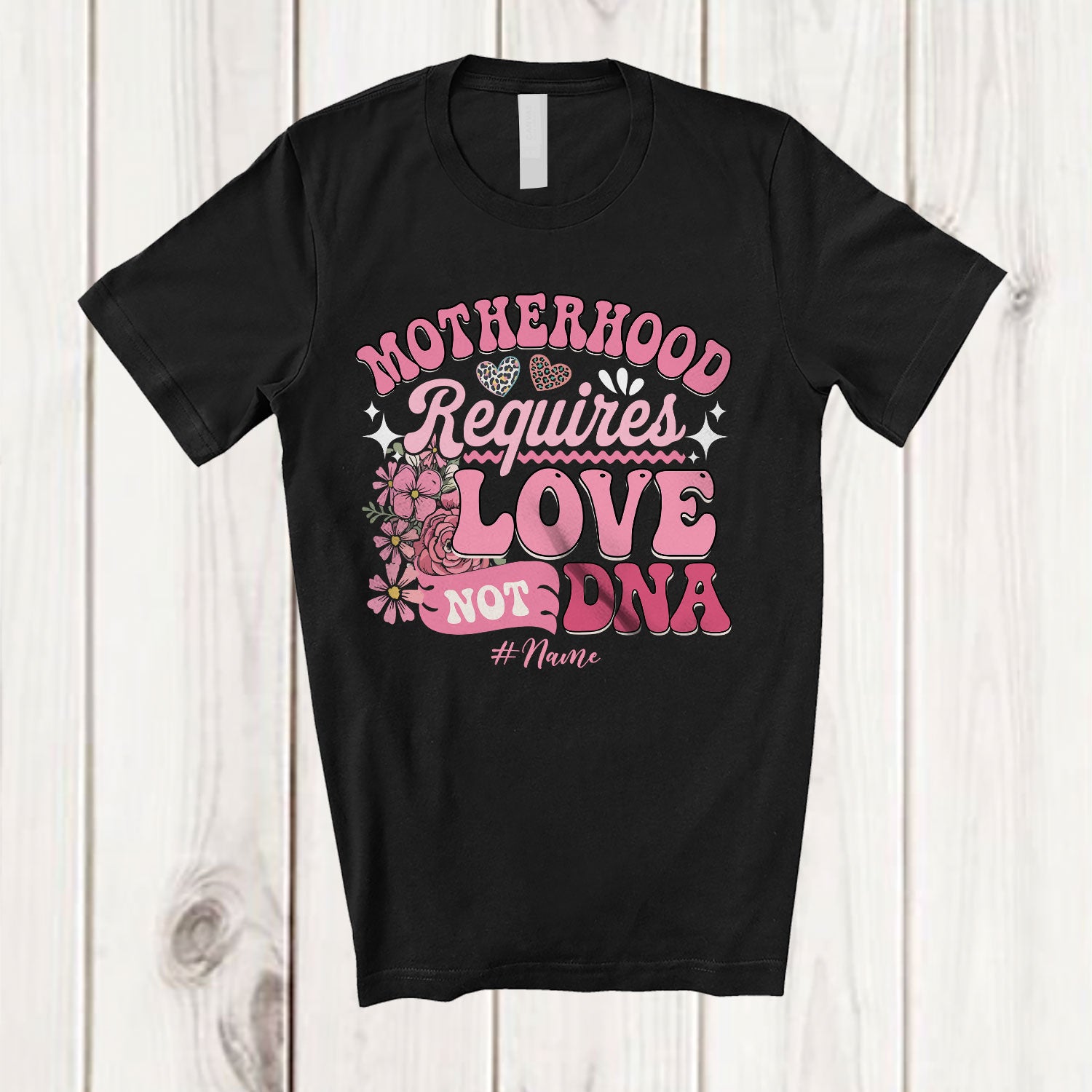 This Personalized Custom Name Motherhood Requires Love Not A DNA; Amazing Mother's Day Flowers T-Shirt is great idea gift for your family, friends in this birthday, christmas, mother's day, father's day, patrick's day or any holiday.