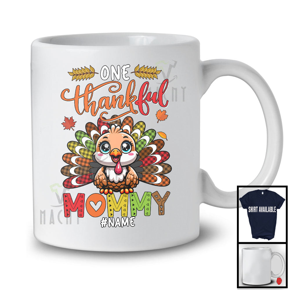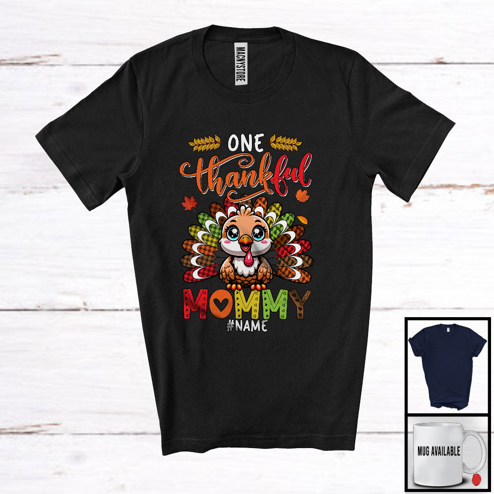 Personalized Custom Name One Thankful Mommy; Amusing Thanksgiving Turkey Plaid Tail; Family T-Shirt. This cotton t-shirt is a durable staple product with a classic fit. One of the most popular items, it has a relaxed style made for everyday and casual wear.