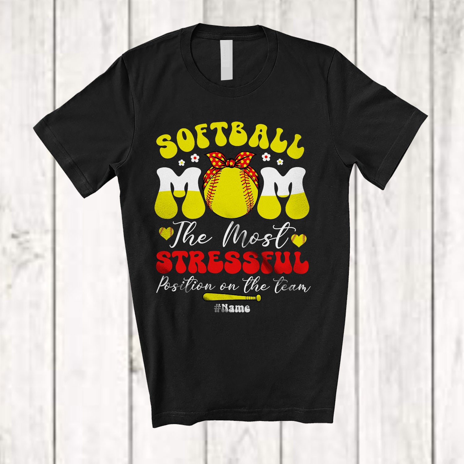 Personalized Custom Name softball Mom Most Stressful Position; Joyful Mother's Day Player; Family T-Shirt. This cotton t-shirt is a durable staple product with a classic fit. One of the most popular items, it has a relaxed style made for everyday and casual wear.