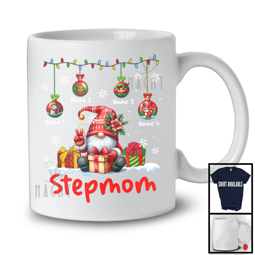 Personalized Custom Name Stepmom; Adorable Christmas Lights Ornaments Gnomes; Family T-Shirt. This cotton t-shirt is a durable staple product with a classic fit. One of the most popular items, it has a relaxed style made for everyday and casual wear.