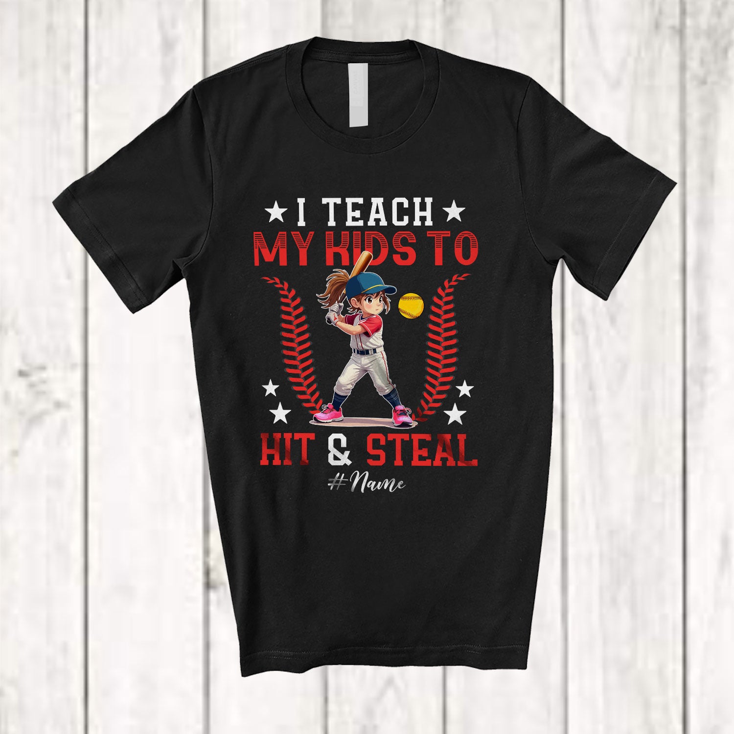 Personalized Custom Name Teach My Kids to Hit Steal; Joyful Father's Day Mother's Day Softball T-Shirt. This cotton t-shirt is a durable staple product with a classic fit. One of the most popular items, it has a relaxed style made for everyday and casual wear.
