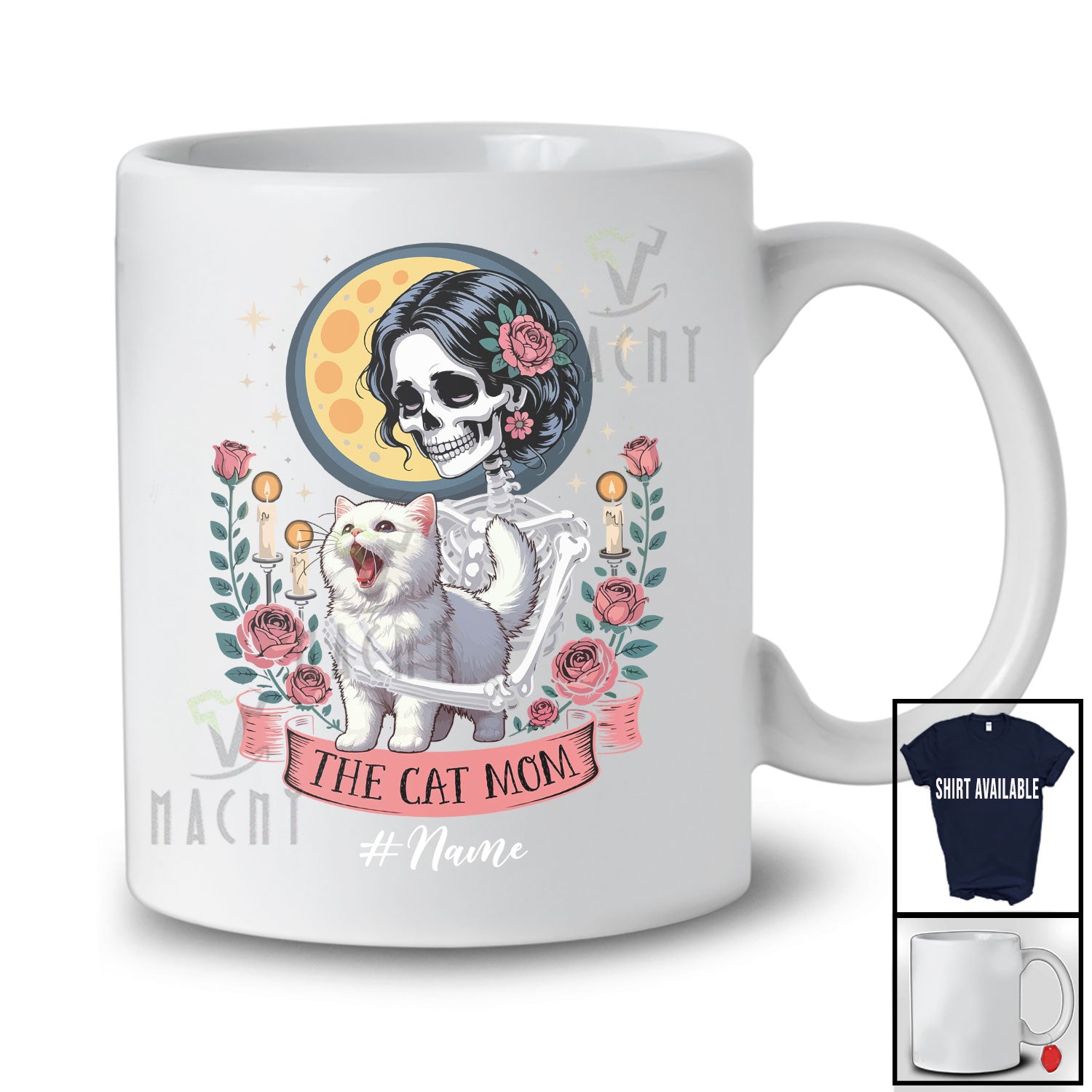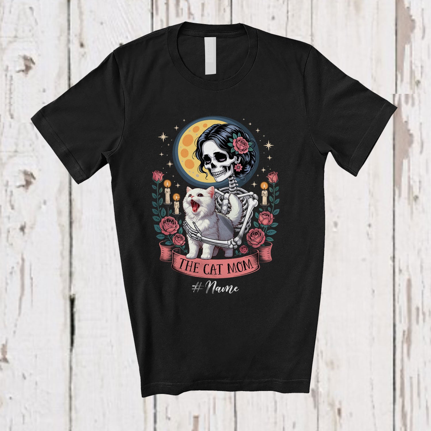 Personalized Custom Name The Cat Mom; Humorous Halloween Skeleton Flowers; Family T-Shirt. This cotton t-shirt is a durable staple product with a classic fit. One of the most popular items, it has a relaxed style made for everyday and casual wear.