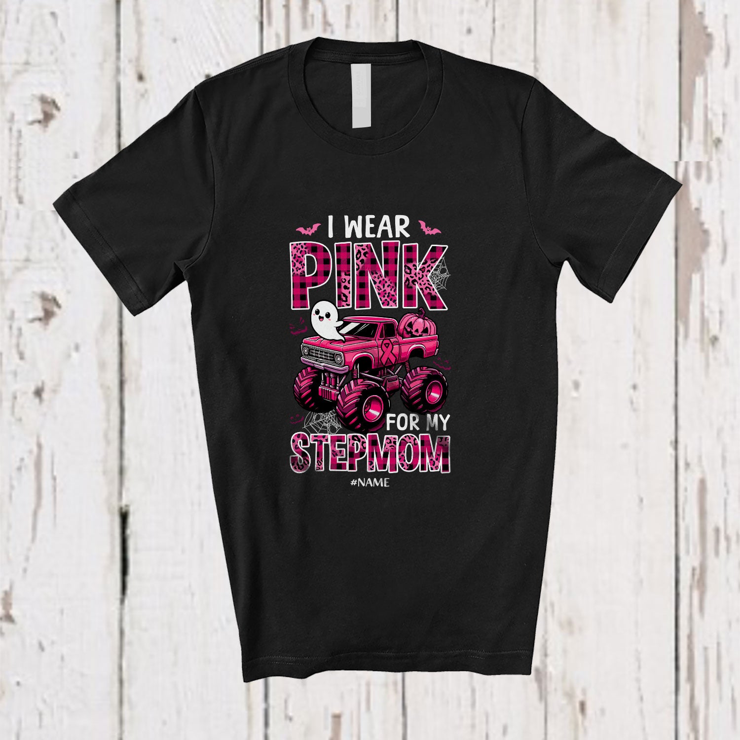 Personalized Custom Name Wear Pink For Stepmom Lovely Halloween Breast Cancer Plaid Monster Truck T-Shirt. This cotton t-shirt is a durable staple product with a classic fit. One of the most popular items, it has a relaxed style made for everyday and casual wear.