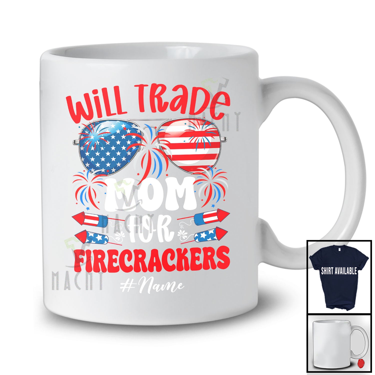 Personalized Custom Name Will Trade Mom For Firecrackers; Proud 4th Of July Sunglasses; Family T-Shirt. This cotton t-shirt is a durable staple product with a classic fit. One of the most popular items, it has a relaxed style made for everyday and casual wear.