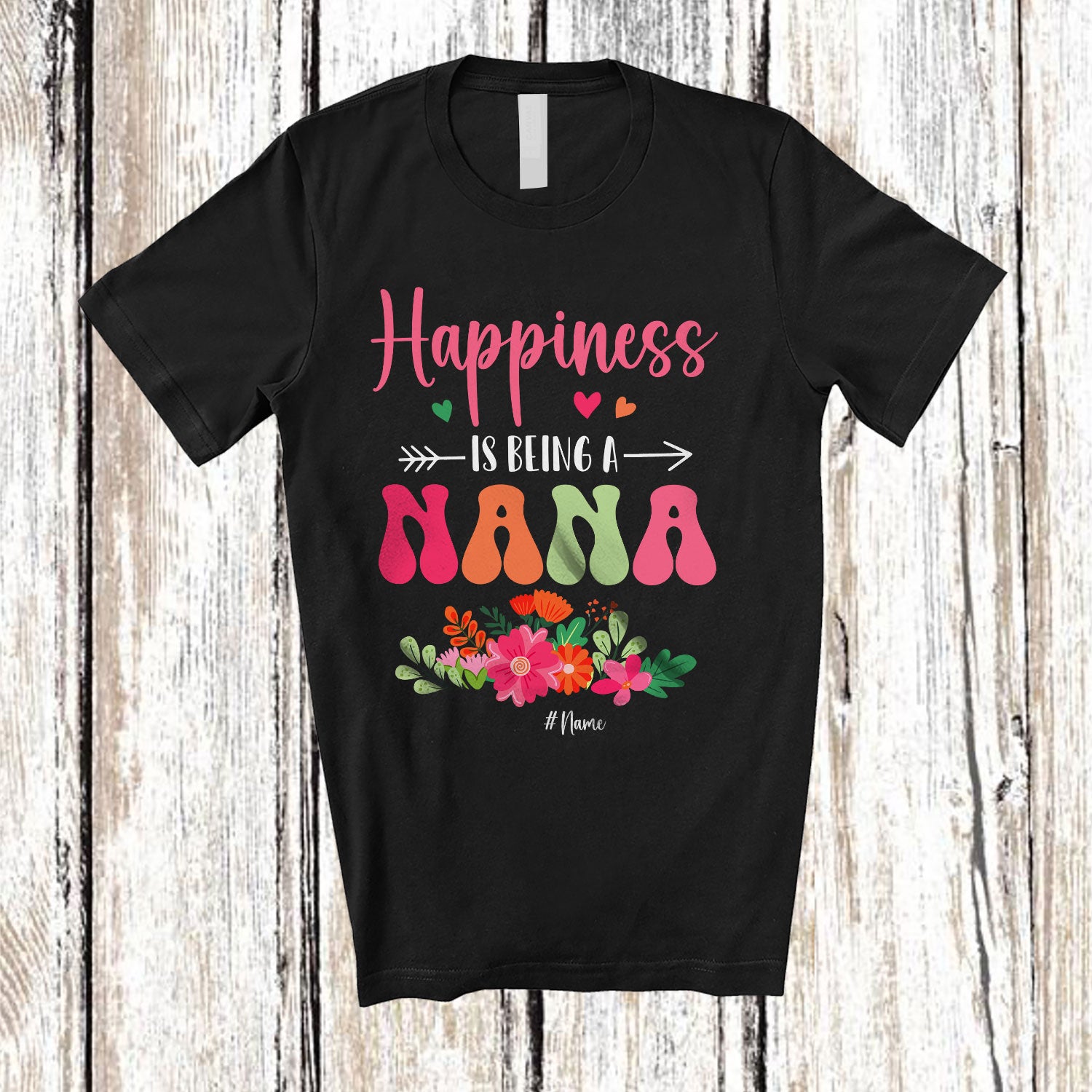 This Personalized Happiness Is Being A Nana; Amazing Mother's Day Flowers Floral; Custom Name Family T-Shirt is great idea gift for your family, friends in this birthday, christmas, mother's day, father's day, patrick's day or any holiday.