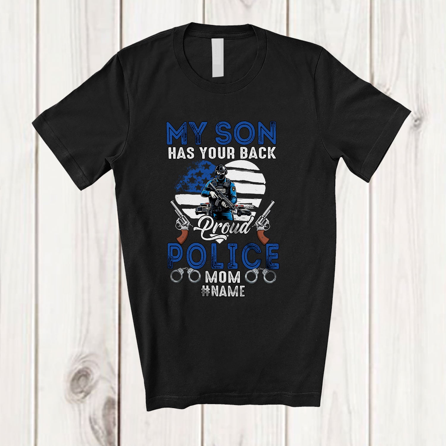 Personalized My Son Has Your Back; Proud Mother's Day Police Heart; Custom Name Family T-Shirt