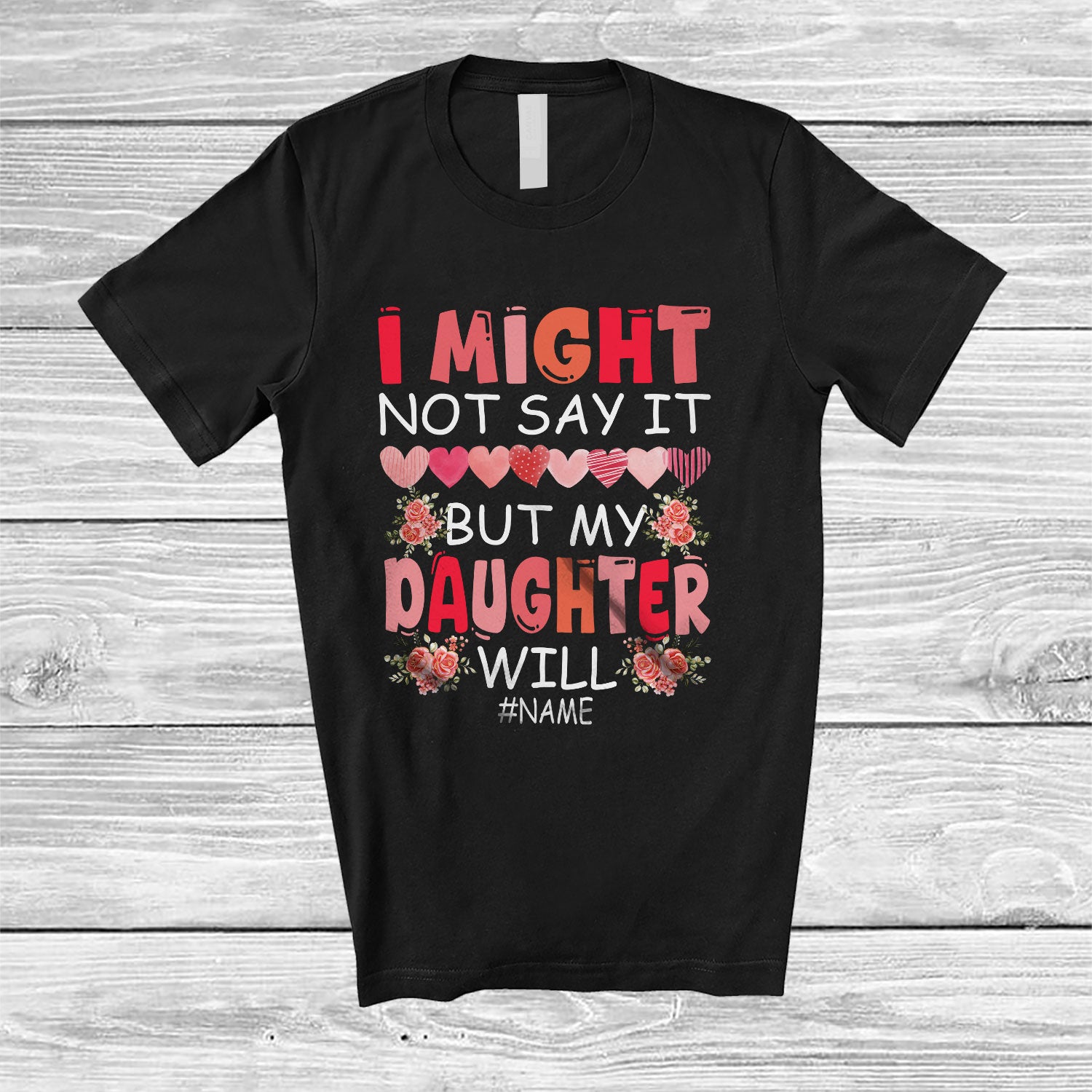 Personalized Not Say It But My Daughter Will; Lovely Mother's Day Hearts; Custom Name Family T-Shirt. This cotton t-shirt is a durable staple product with a classic fit. One of the most popular items, it has a relaxed style made for everyday and casual wear.