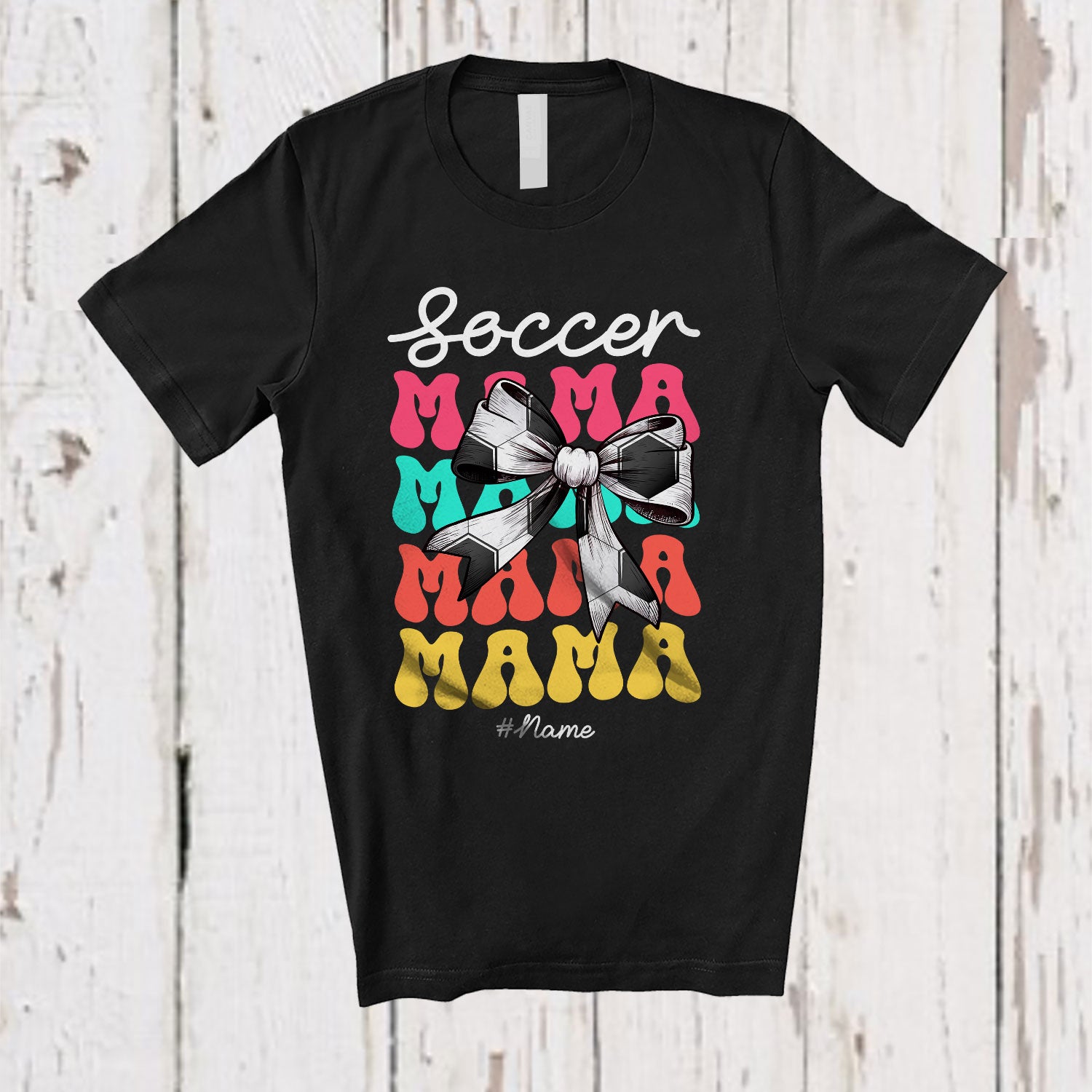 Personalized Soccer Mama; Cheerful Mother's Day Coquette Bow Soccer Custom Name Player T-Shirt. This cotton t-shirt is a durable staple product with a classic fit. One of the most popular items, it has a relaxed style made for everyday and casual wear.