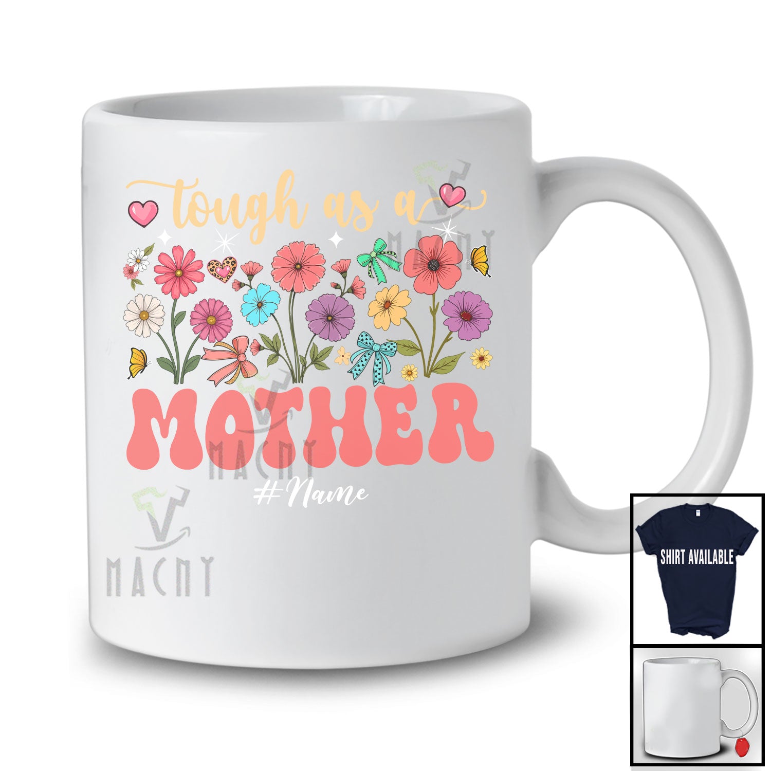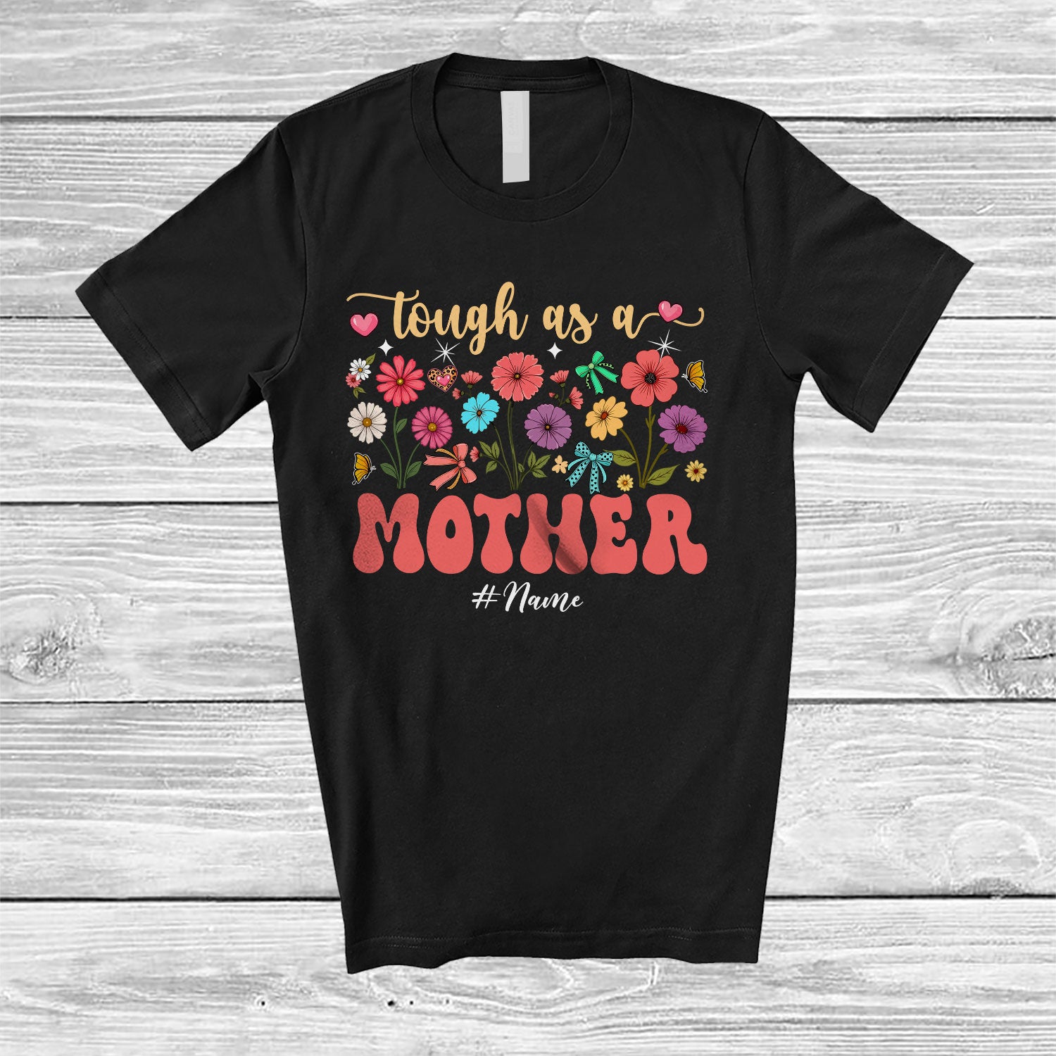Personalized Tough As A Mother; Floral Mother's Day Flowers; Custom Name Mom Family T-Shirt. This cotton t-shirt is a durable staple product with a classic fit. One of the most popular items, it has a relaxed style made for everyday and casual wear.