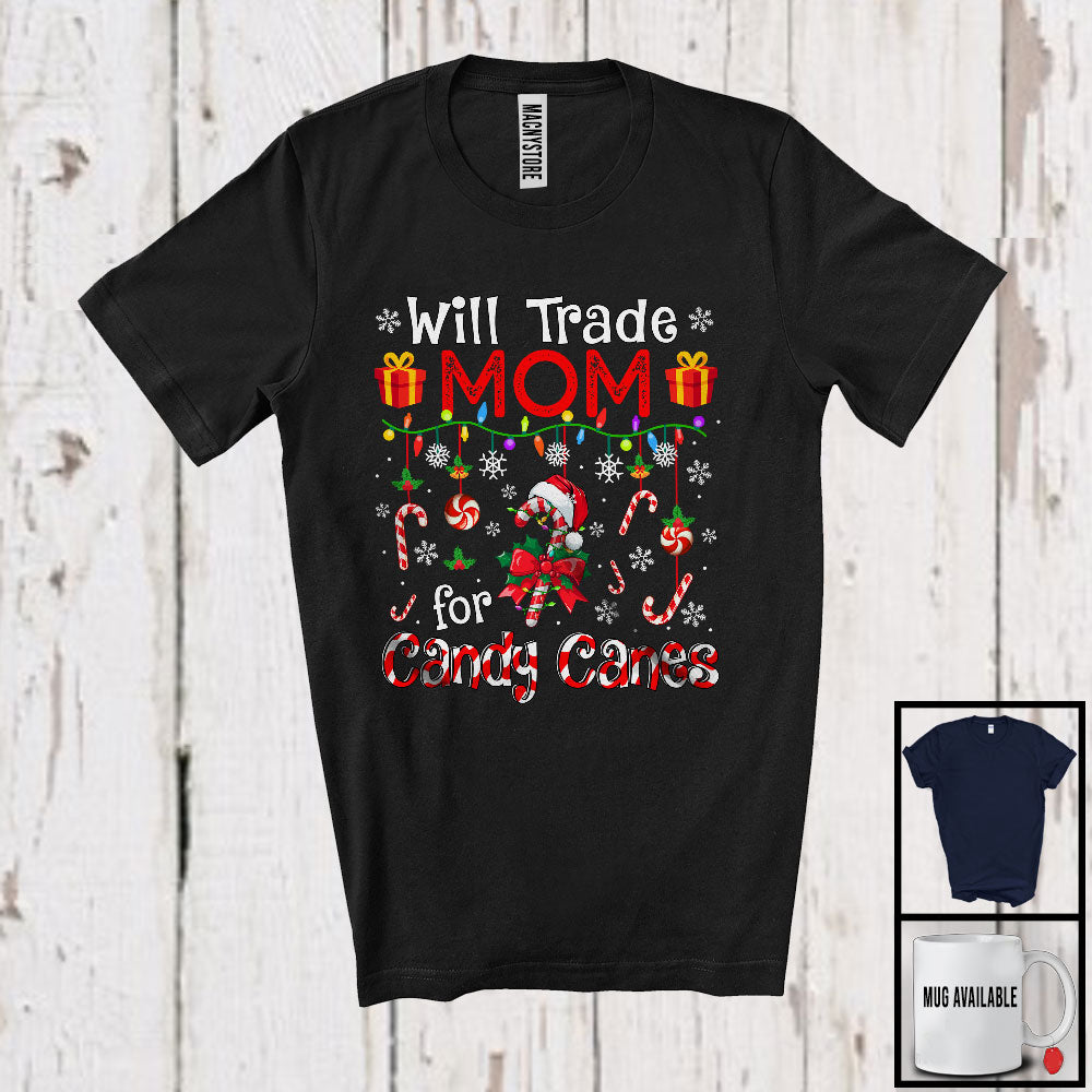 Will Trade Mom For Candy Canes; Wonderful Christmas Lights Santa Candy Cane; Family Group T-Shirt. This cotton t-shirt is a durable staple product with a classic fit. One of the most popular items, it has a relaxed style made for everyday and casual wear.