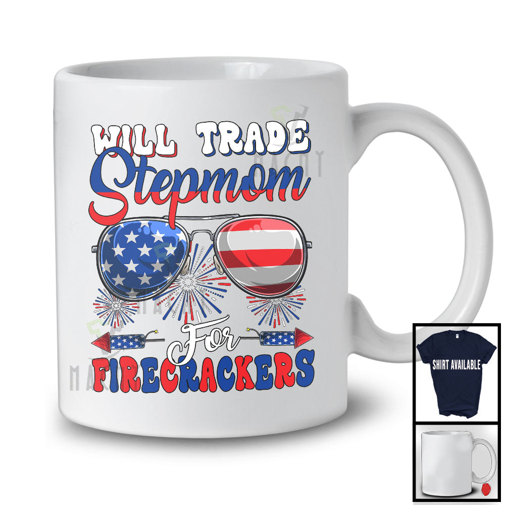 Will Trade Stepmom For Firecrackers, Cheerful 4th Of July American Flag Sunglasses, Patriotic Family T-Shirt. This cotton t-shirt is a durable staple product with a classic fit. One of the most popular items, it has a relaxed style made for everyday and casual wear.