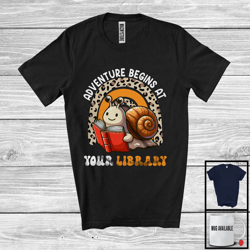 new MacnyStore - Adventure Begins At Your Library, Adorable Summer Snail Reading Book, Leopard Rainbow T-Shirt – Macnystore