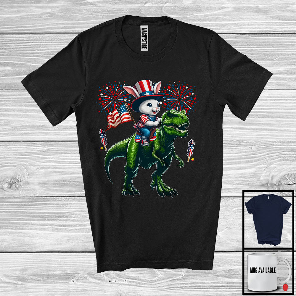 • Bunny Riding T-Rex, Humorous 4th Of July American Flag Pride Bunny T-Rex, Patriotic Group T-Shirt. This cotton t-shirt is a durable staple product with a classic fit. One of the most popular items, it has a relaxed style made for everyday and casual wear.