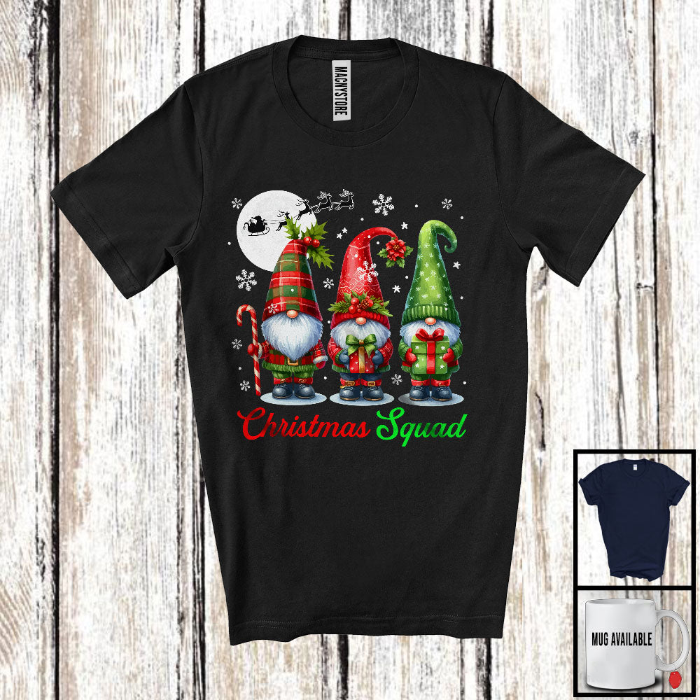 • Christmas Squad; Merry X-mas Moon Three Gnomes Gnomies Lover; Snowing Family Group T-Shirt. This cotton t-shirt is a durable staple product with a classic fit. One of the most popular items, it has a relaxed style made for everyday and casual wear.