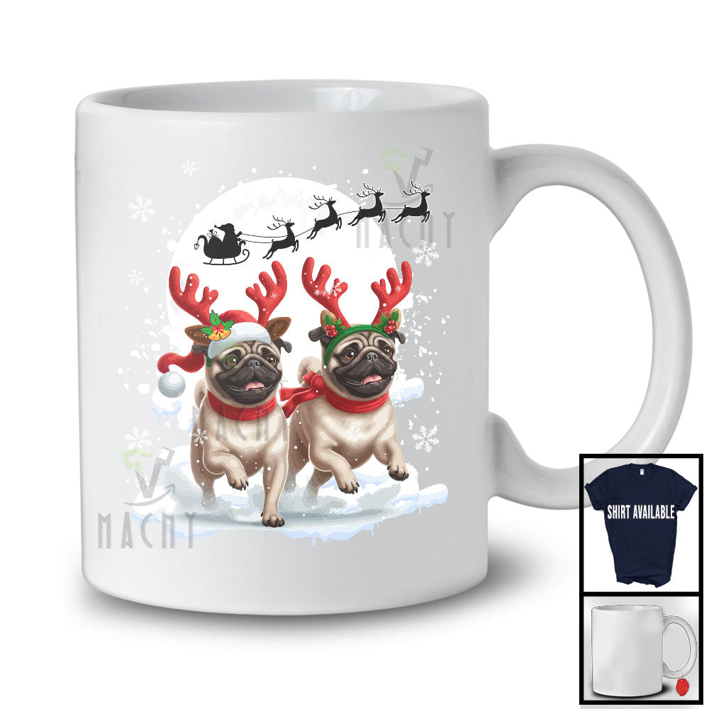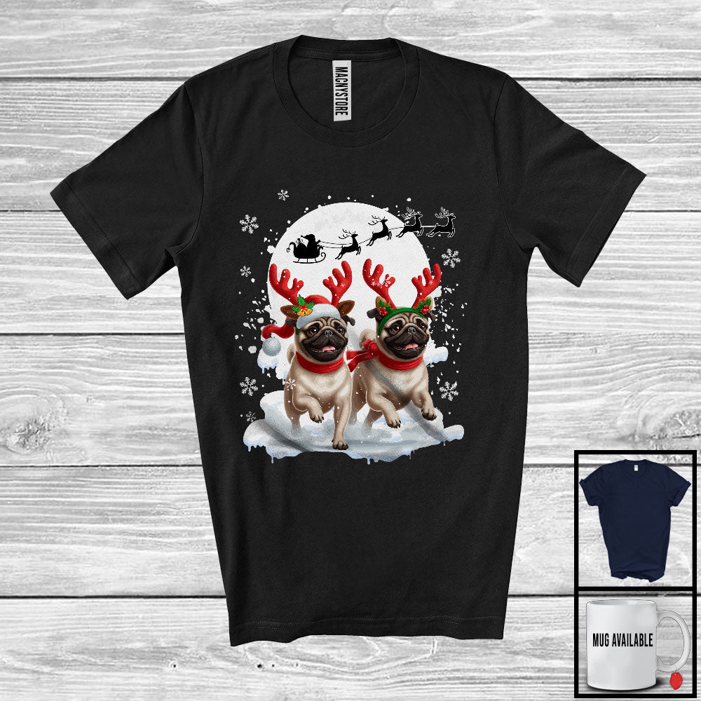 new MacnyStore - Christmas Two Pugs Reindeer Running; Fantastic X-mas Moon Snowing; Dog Owner Lover T-Shirt – Macnystore