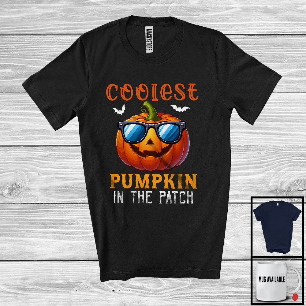 Coolest Pumpkin In The Patch; Awesome Halloween Carved Pumpkin Sunglasses; Family Group T-Shirt. This cotton t-shirt is a durable staple product with a classic fit. One of the most popular items, it has a relaxed style made for everyday and casual wear.