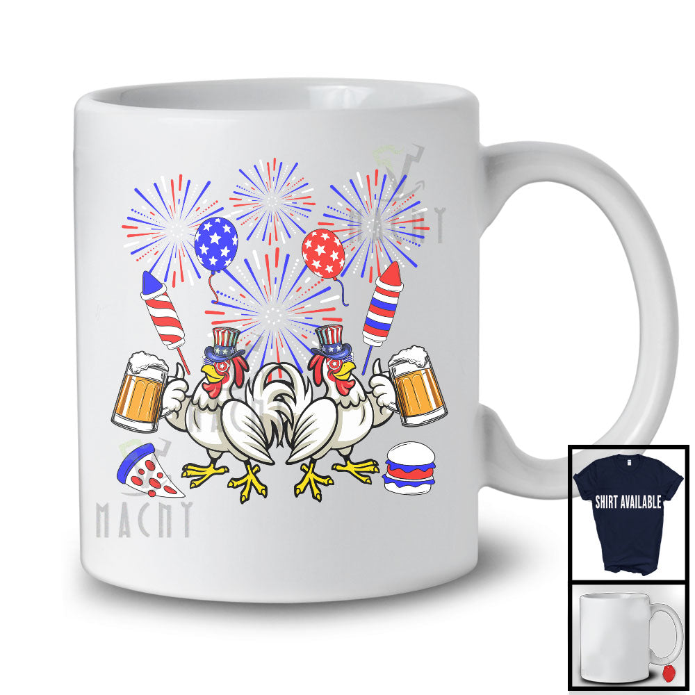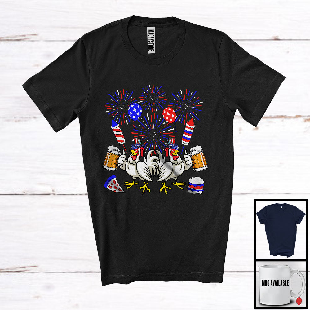 Couple Two Chicken Drinking Beer, Humorous 4th Of July Fireworks Farm, Farmer Patriotic T-Shirt