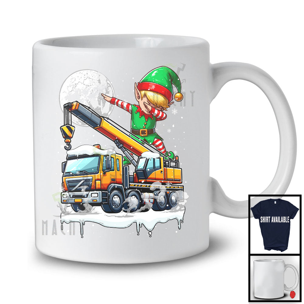 • Dabbing Elf On Crane Truck; Joyful Christmas Moon Snowing Elf; Crane Truck Driver Lover T-Shirt. This cotton t-shirt is a durable staple product with a classic fit. One of the most popular items, it has a relaxed style made for everyday and casual wear.