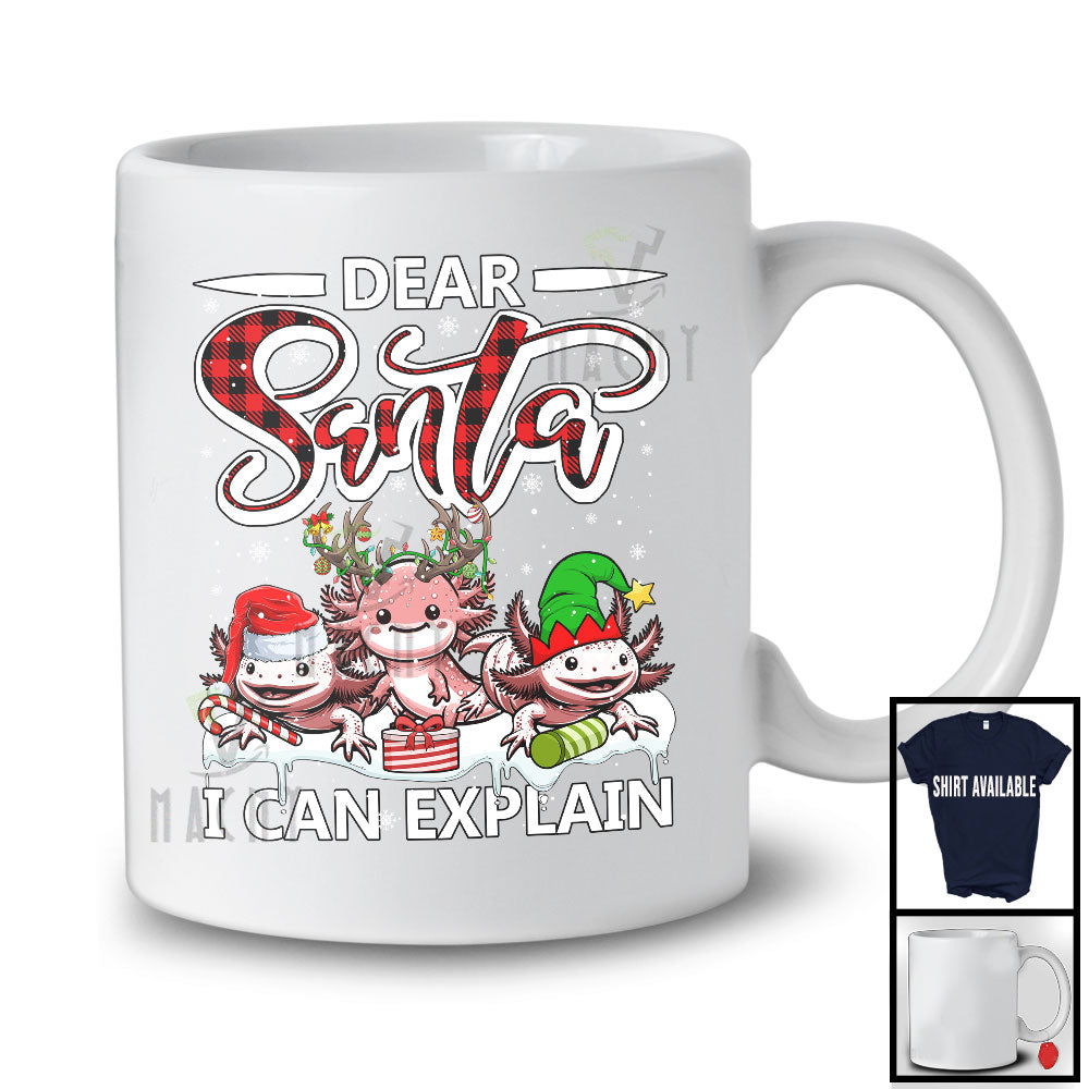 • Dear Santa I Can Explain; Awesome Christmas Red Plaid Three Axolotls; Snowing Around Family T-Shirt. This cotton t-shirt is a durable staple product with a classic fit. One of the most popular items, it has a relaxed style made for everyday and casual wear.