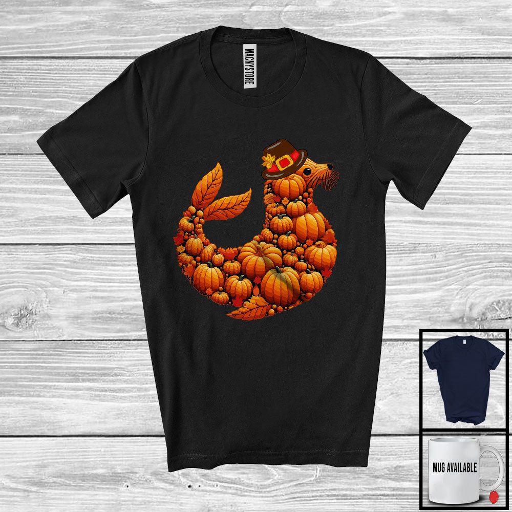 Fall Autumn Leaves Pumpkin Sea Lion Shape; Amazing Thanksgiving Sea Animal; Family Group T-Shirt