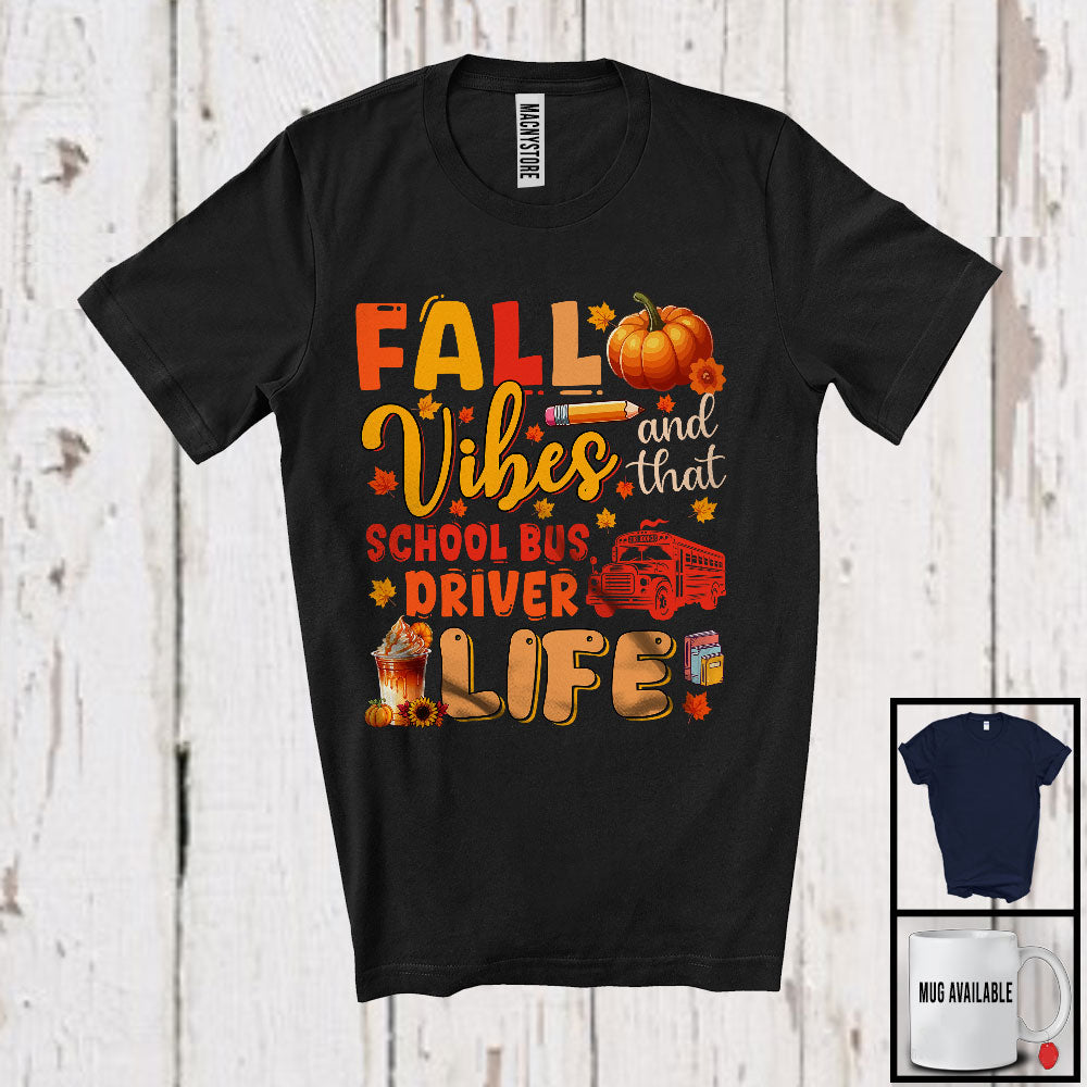 Fall Vibes And That School Bus Driver; Wonderful Thanksgiving Autumn Leaf Pumpkin; Proud Jobs T-Shirt. This cotton t-shirt is a durable staple product with a classic fit. One of the most popular items, it has a relaxed style made for everyday and casual wear.