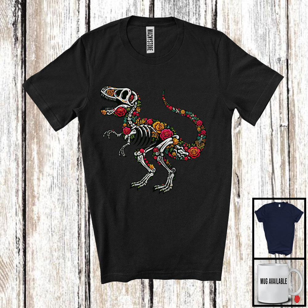 new MacnyStore - Floral Skulls T-Rex; Scary Halloween Dia De Los Muertos Cosplay; Flowers Mexican Family T-Shirt – Macnystore
