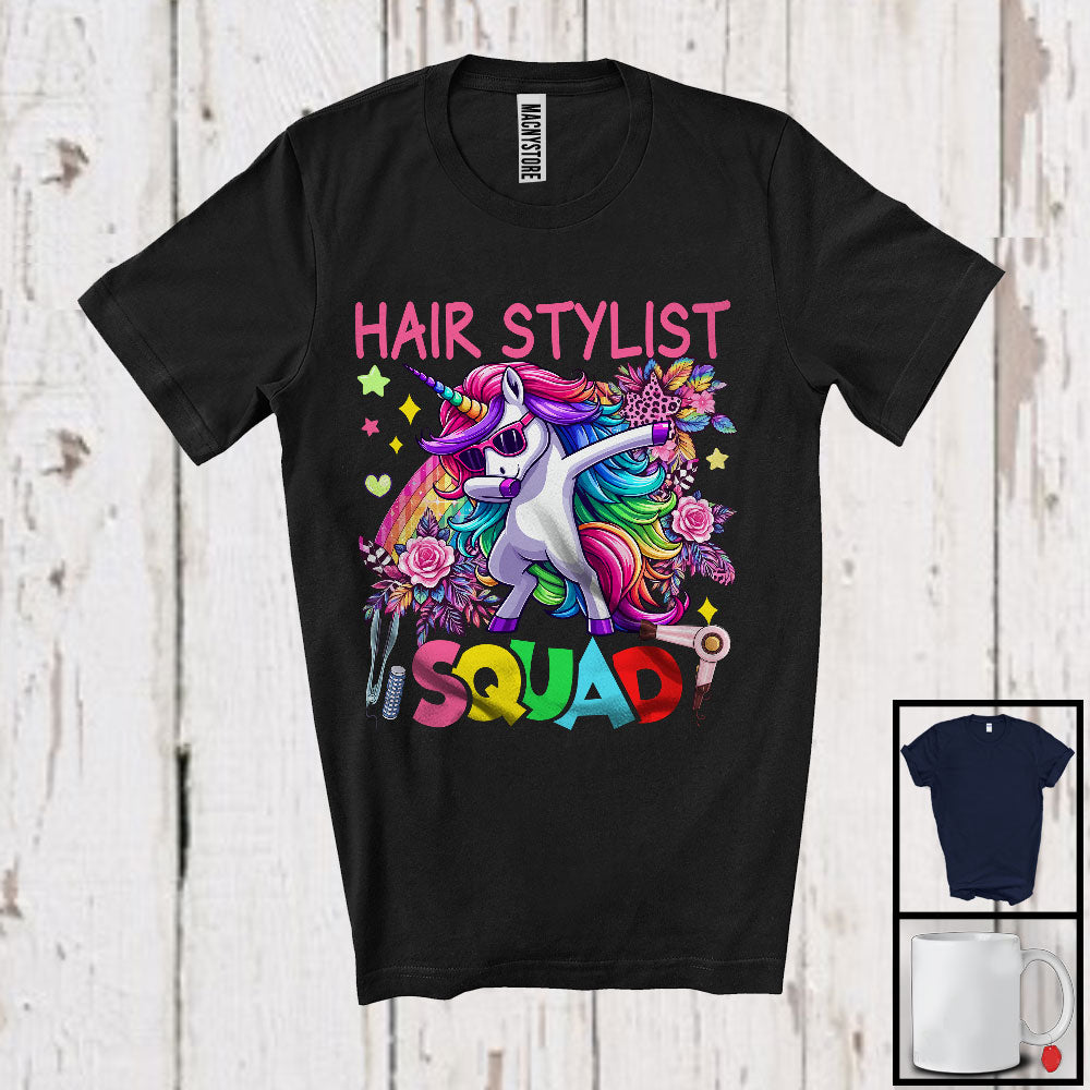 Hair Stylist Squad, Lovely Dabbing Unicorn Sunglasses Leopard Flowers, Hair Stylist Group T-Shirt. This cotton t-shirt is a durable staple product with a classic fit. One of the most popular items, it has a relaxed style made for everyday and casual wear.