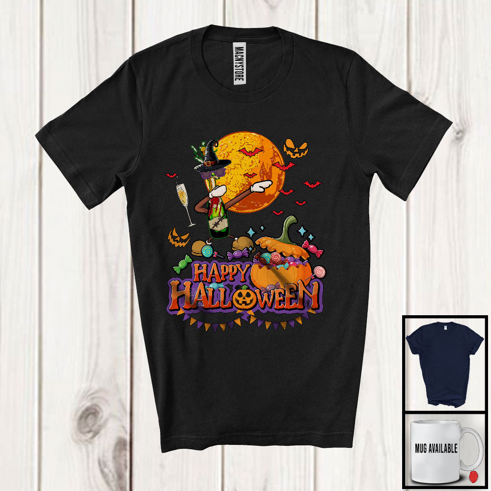 • Happy Halloween, Cheerful Zombie Witch Champagne Dabbing, Drinking Lover Drunker Team T-Shirt. This cotton t-shirt is a durable staple product with a classic fit. One of the most popular items, it has a relaxed style made for everyday and casual wear.