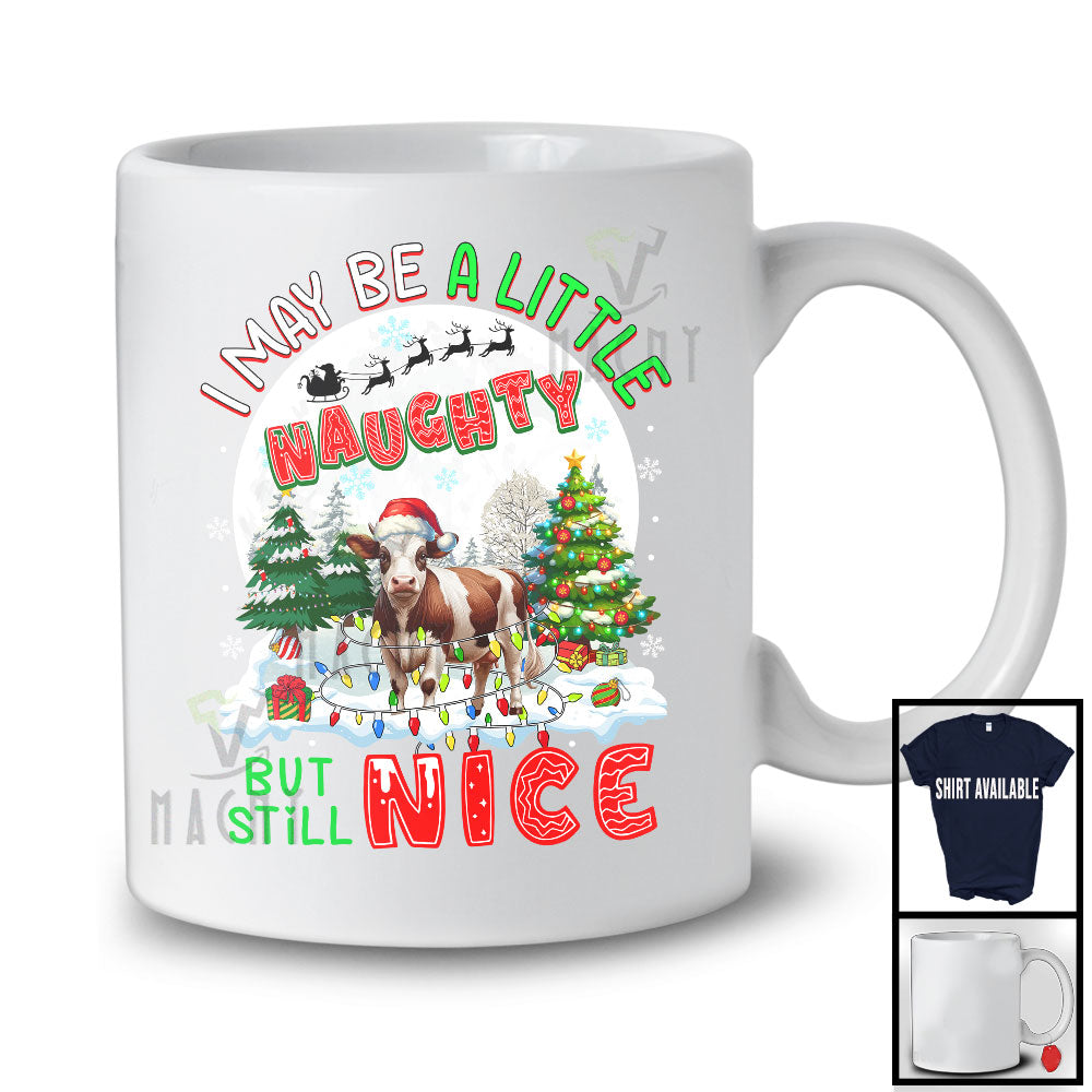 • I May Be A Little Naughty But Still Nice; Humorous Christmas Cow Santa; X-mas Moon T-Shirt. This cotton t-shirt is a durable staple product with a classic fit. One of the most popular items, it has a relaxed style made for everyday and casual wear.