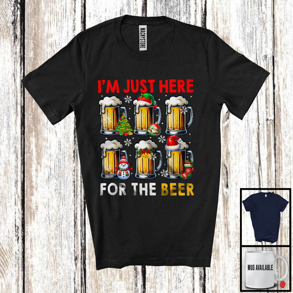 I'm Just Here For The Beer; Humorous Christmas Santa Elf Drinking Drunker; X-mas Group T-Shirt. This cotton t-shirt is a durable staple product with a classic fit. One of the most popular items, it has a relaxed style made for everyday and casual wear.