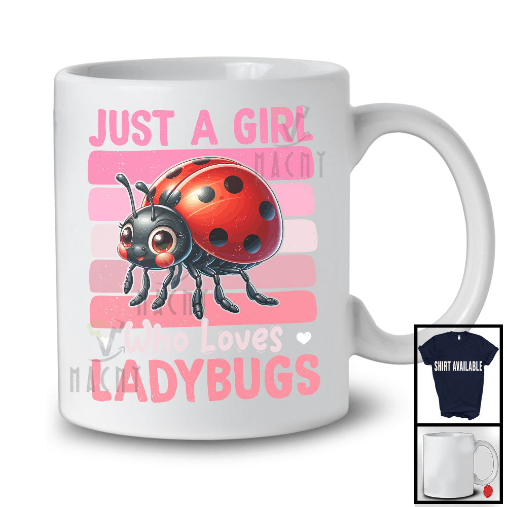Just A Girl Who Loves Ladybugs, Humorous Summer Pink Retro Flowers Ladybugs, Insects Lover T-Shirt. This cotton t-shirt is a durable staple product with a classic fit. One of the most popular items, it has a relaxed style made for everyday and casual wear.