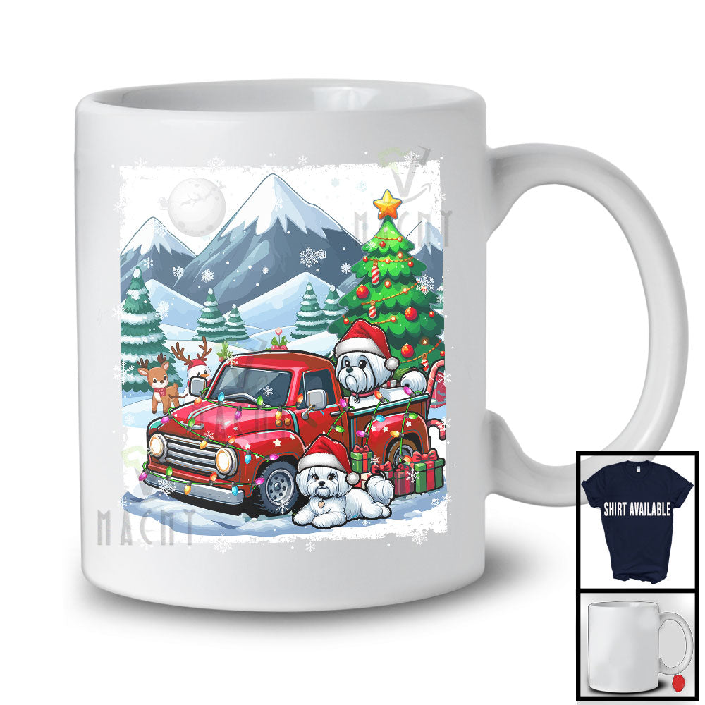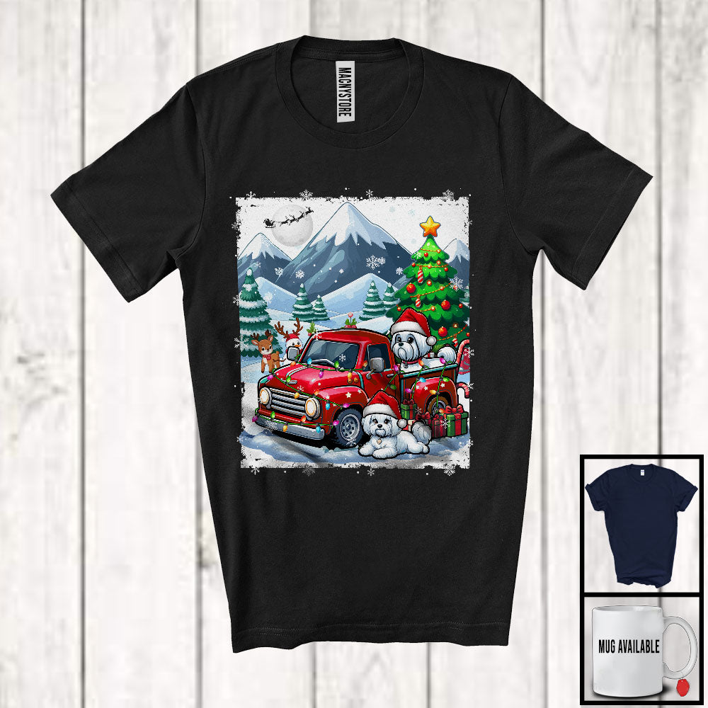 Lovely Santa Maltese Dog With Red Pickup Truck; Cool Christmas Tree Lights; Winter Snowing T-Shirt