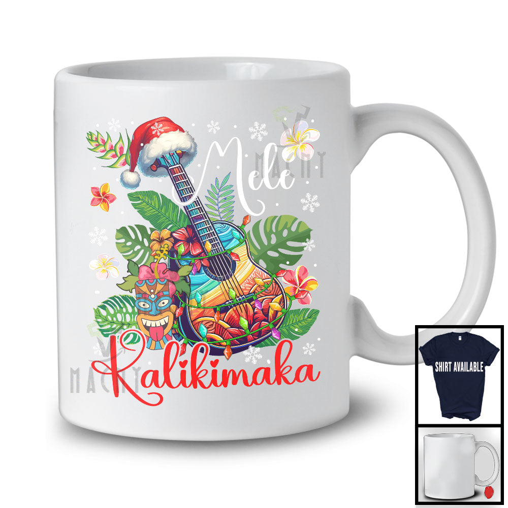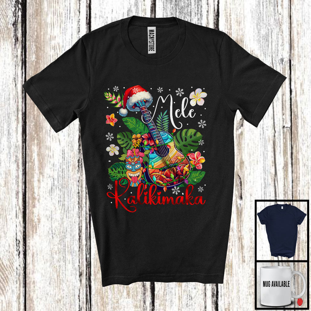 Mele Kalikimaka; Awesome Christmas Lights Guitar Santa; Hawaiian Flowers X-mas Family Group T-Shirt. This cotton t-shirt is a durable staple product with a classic fit. One of the most popular items, it has a relaxed style made for everyday and casual wear.