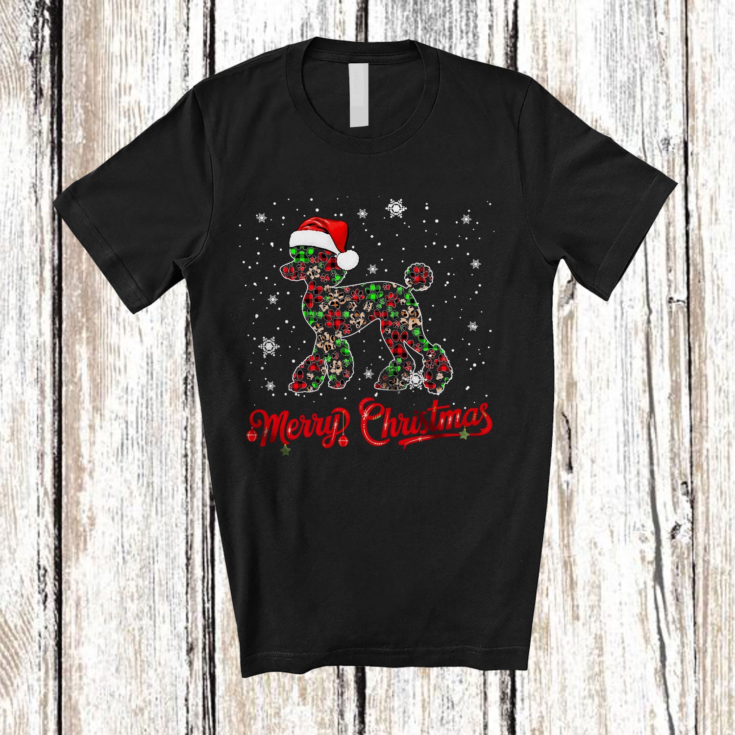 Merry Christmas; Fantastic X-mas Santa Poodle Shape Plaid Paws; Pajamas Family Group T-Shirt. This cotton t-shirt is a durable staple product with a classic fit. One of the most popular items, it has a relaxed style made for everyday and casual wear.