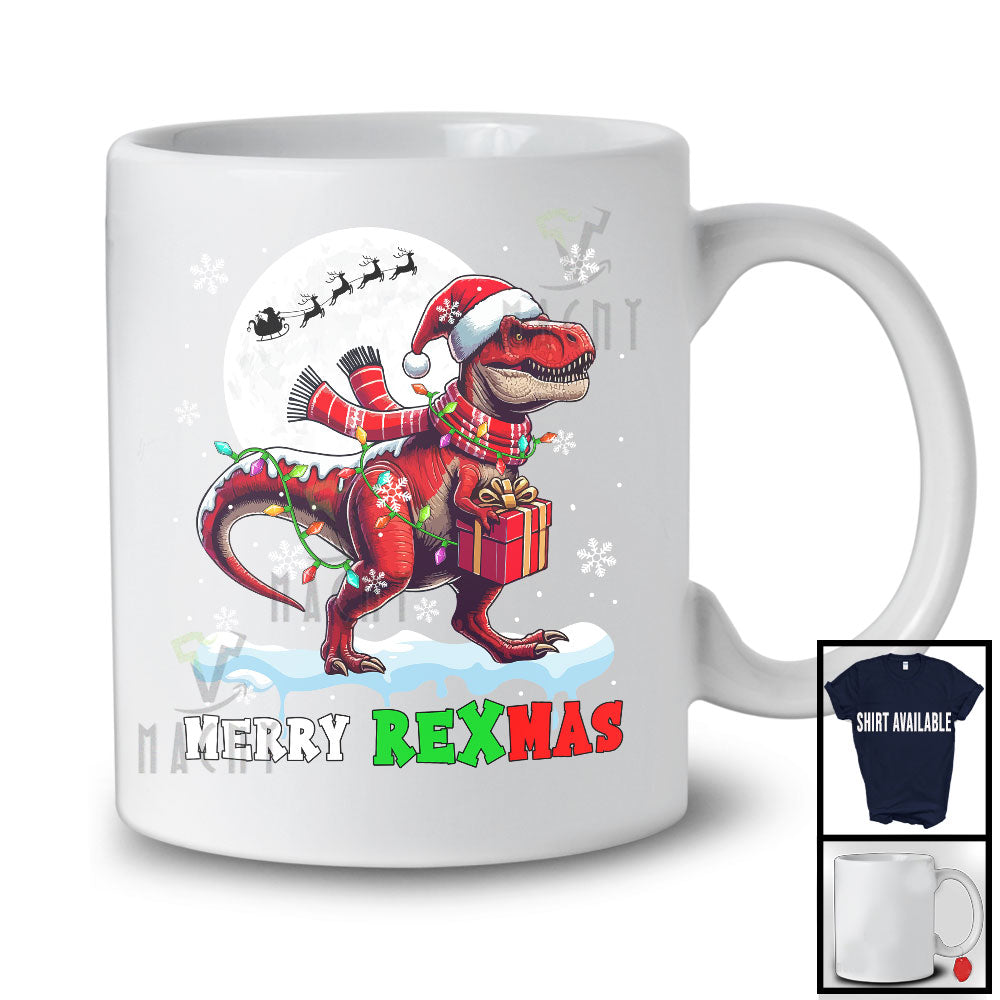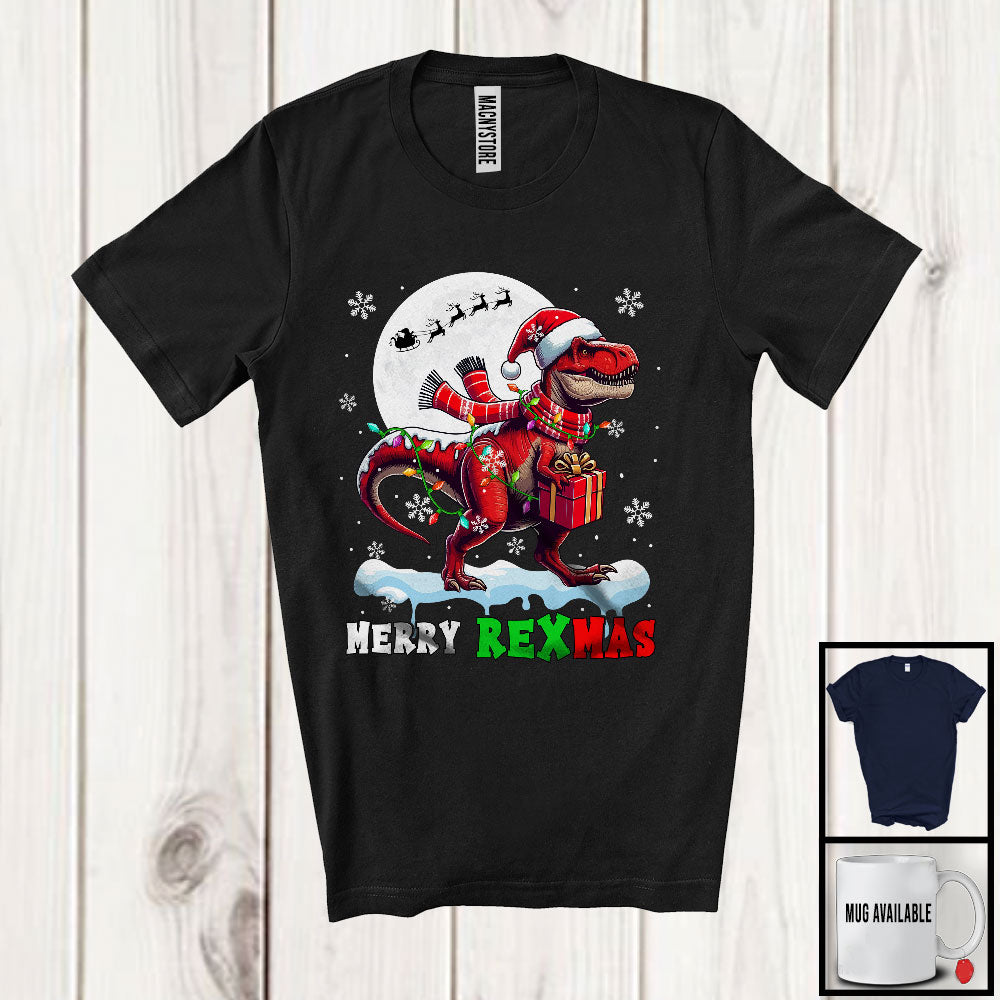 Merry Rexmas; Awesome Christmas Santa T-Rex Snowing Moon; Dinosaur Lover Family Group T-Shirt. This cotton t-shirt is a durable staple product with a classic fit. One of the most popular items, it has a relaxed style made for everyday and casual wear.