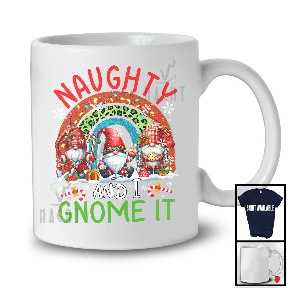Naughty And I Gnome It; Adorable Christmas Plaid Gnomes Gnomies Squad; Leopard Rainbow T-Shirt. This cotton t-shirt is a durable staple product with a classic fit. One of the most popular items, it has a relaxed style made for everyday and casual wear.