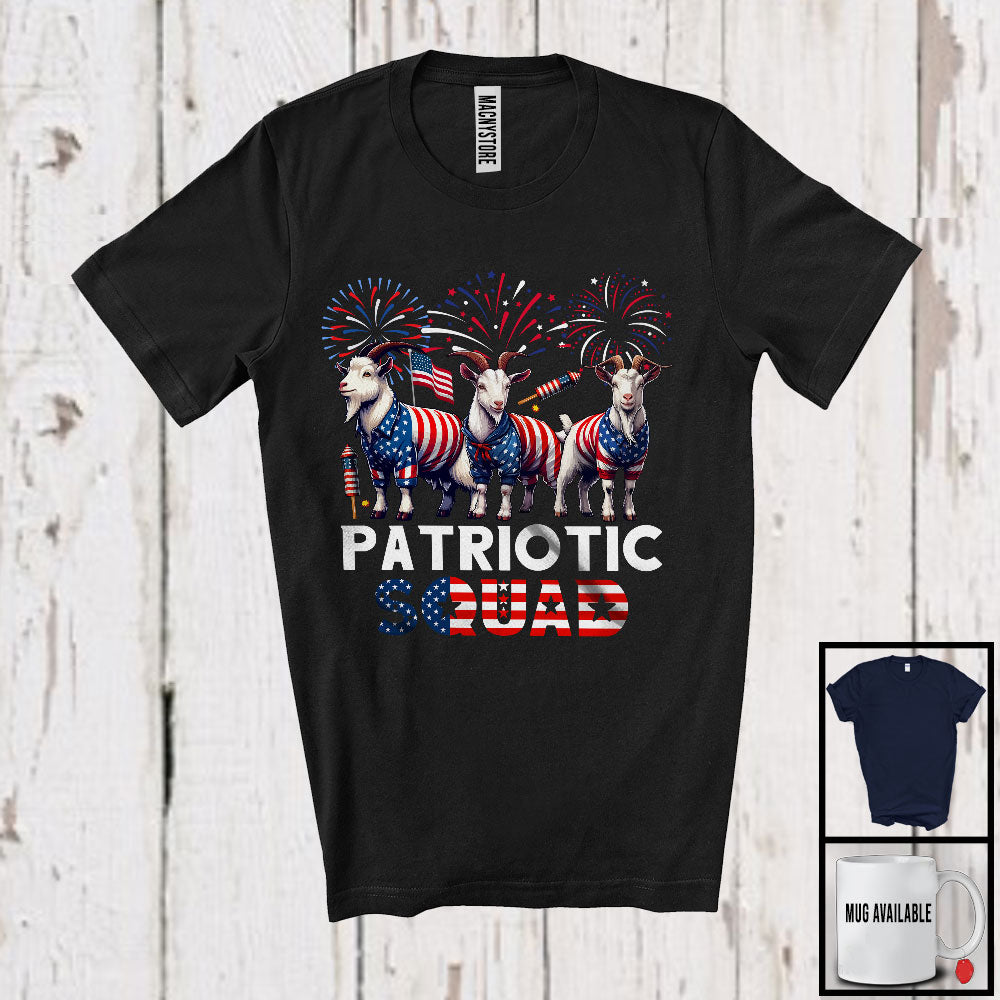 Patriotic Squad, Awesome 4th Of July Three Goat Farmer, American Flag Fireworks Family Group T-Shirt. This cotton t-shirt is a durable staple product with a classic fit. One of the most popular items, it has a relaxed style made for everyday and casual wear.