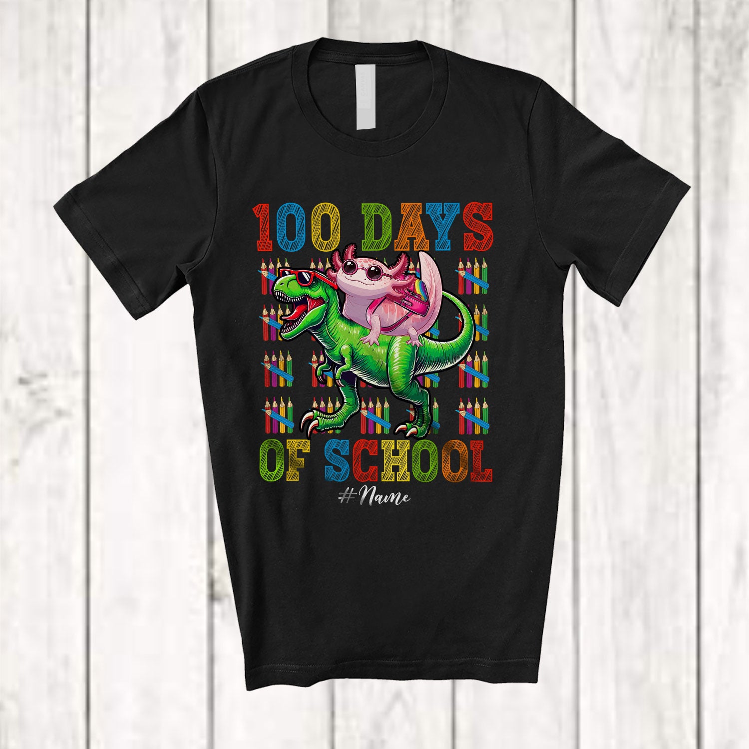 Personalized 100 Days Of School; Lovely Custom Name Axolotl Riding T-Rex Schoolbag T-Shirt