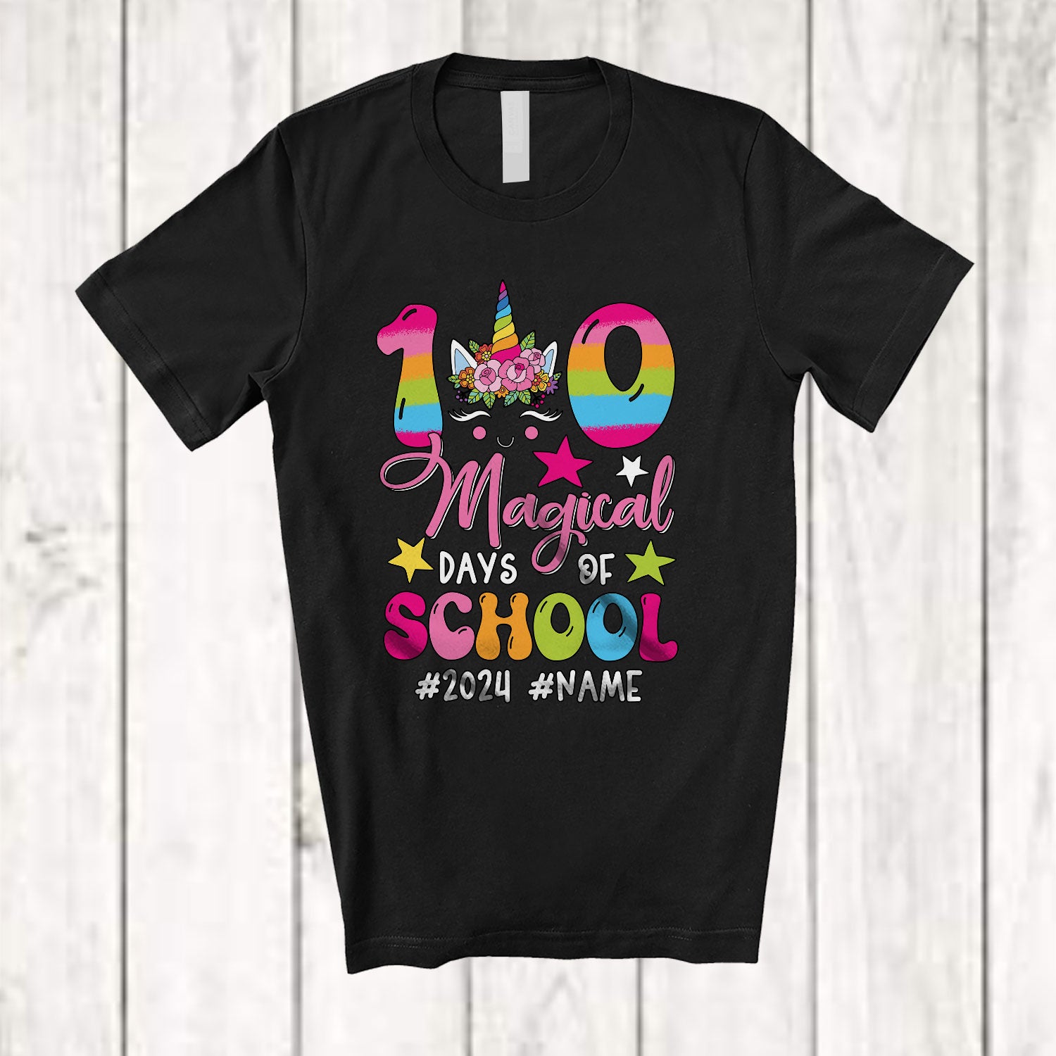 • Personalized 100 Magical Days of School; Adorable Flowers Unicorn; Custom Name Girl Student T-Shirt. This cotton t-shirt is a durable staple product with a classic fit. One of the most popular items, it has a relaxed style made for everyday and casual wear.